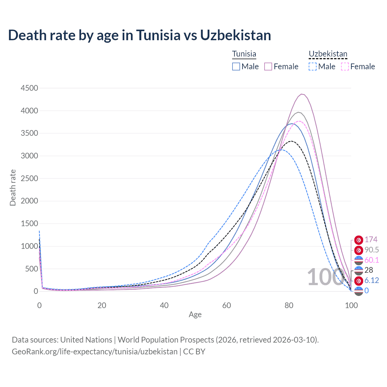 This life expectancy calculator shows the odds of living to 100, 95, 90, and below based on current age for both males and females in Tunisia and Uzbekistan, along with mean and median age of death. The calculations are based on the 2026 life tables (actuarial tables) from the UN World Population Prospects.