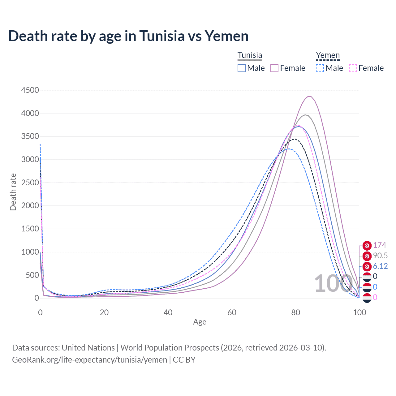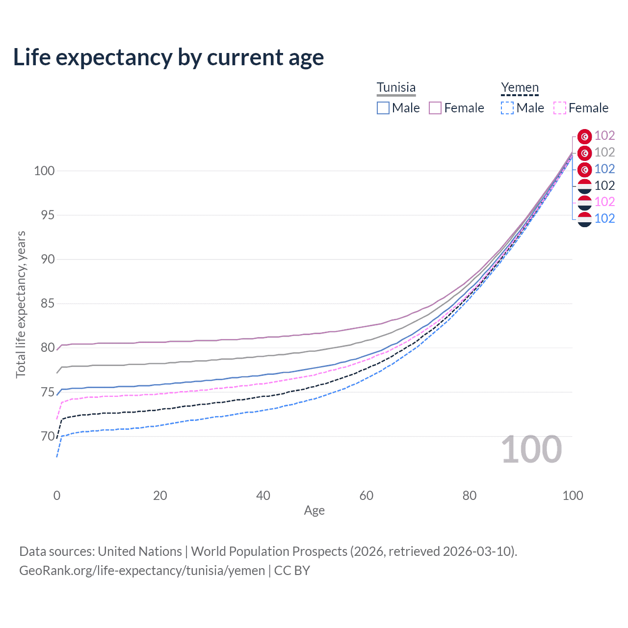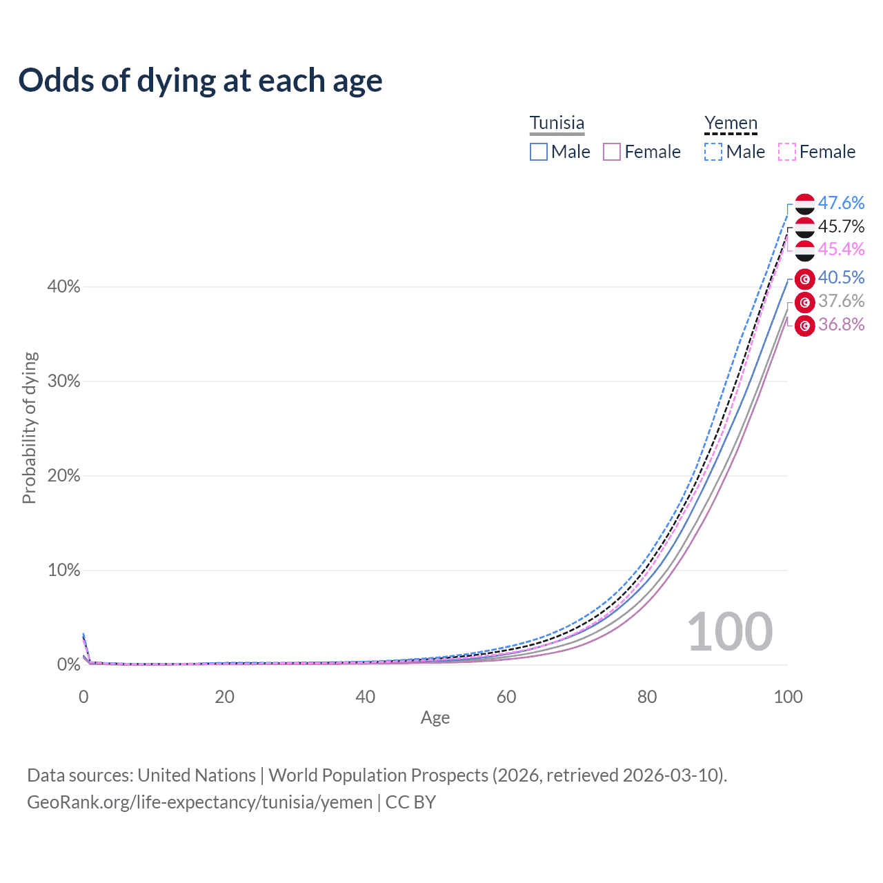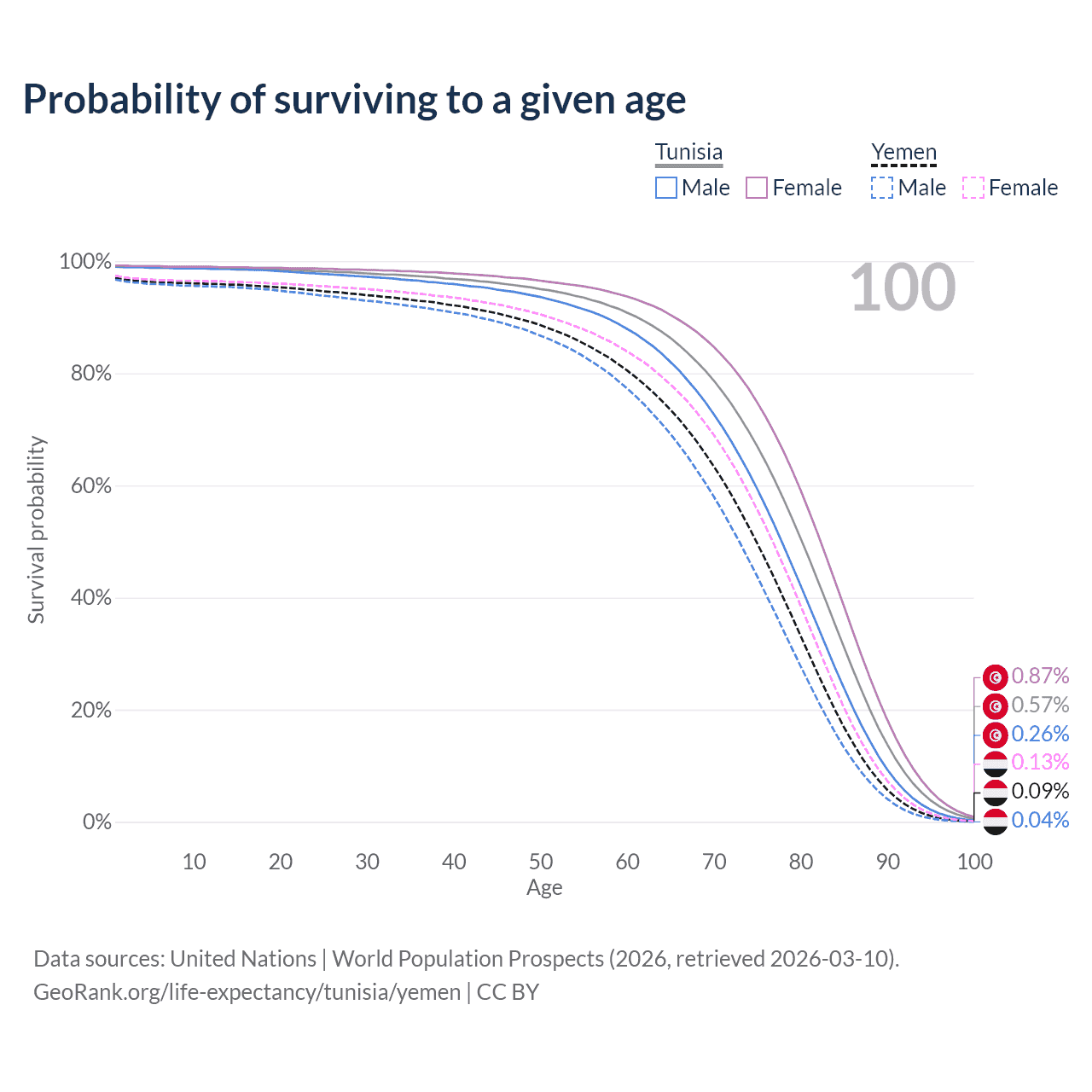 This life expectancy calculator shows the odds of living to 100, 95, 90, and below based on current age for both males and females in Tunisia and Yemen, along with mean and median age of death. The calculations are based on the 2026 life tables (actuarial tables) from the UN World Population Prospects.