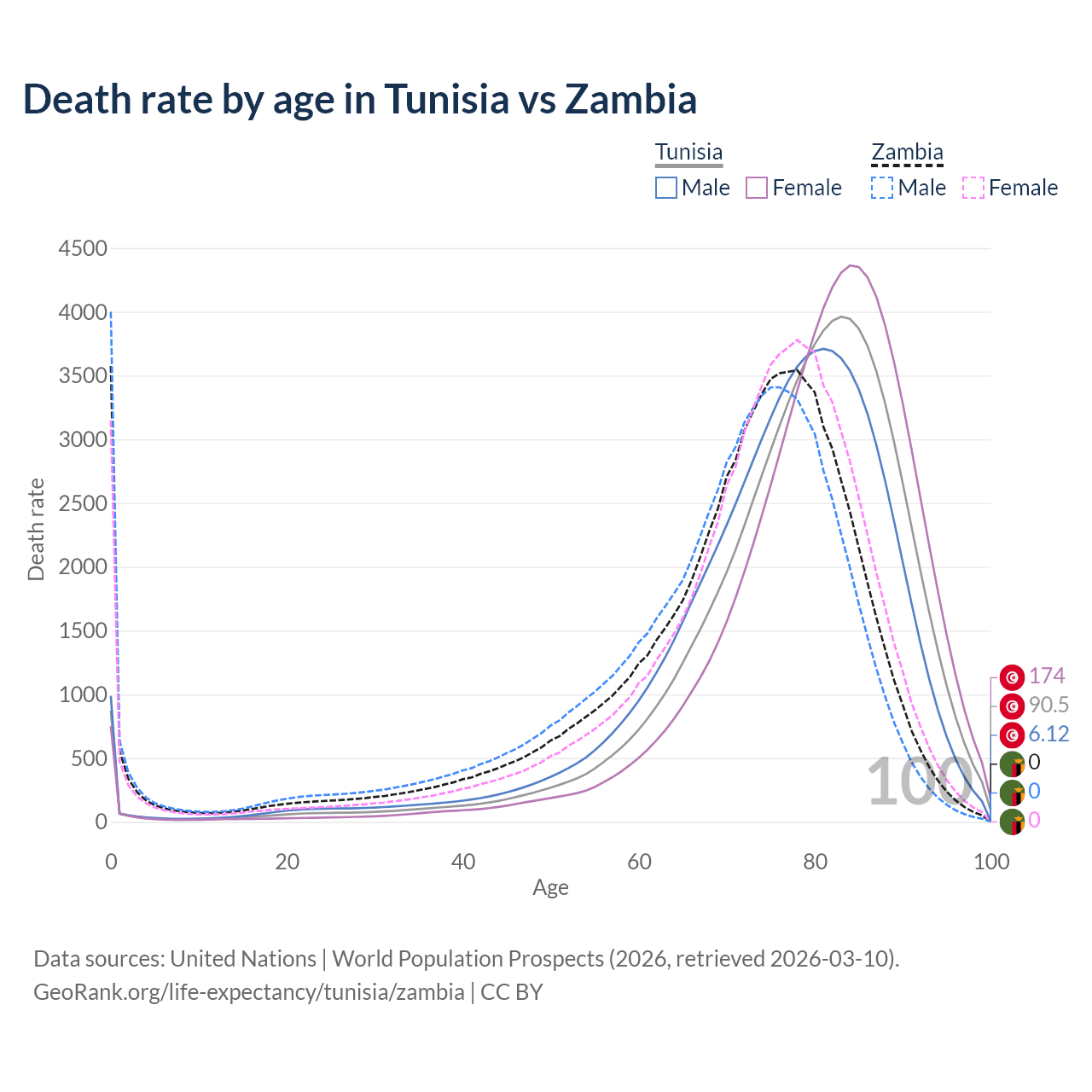 In Tunisia, the most common age of death is 83, compared to 0 in Zambia. The median age of death is 80.2 in Tunisia and 73.1 in Zambia, meaning only half of each cohort is expected to live past that age.