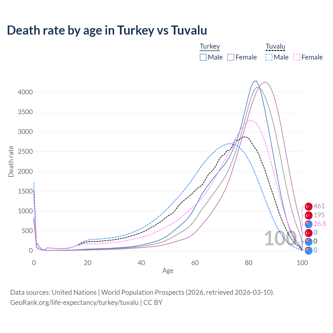 In Turkey, the most common age of death is 83, compared to 78 in Tuvalu. The median age of death is 81.4 in Turkey and 71.9 in Tuvalu, meaning only half of each cohort is expected to live past that age.
