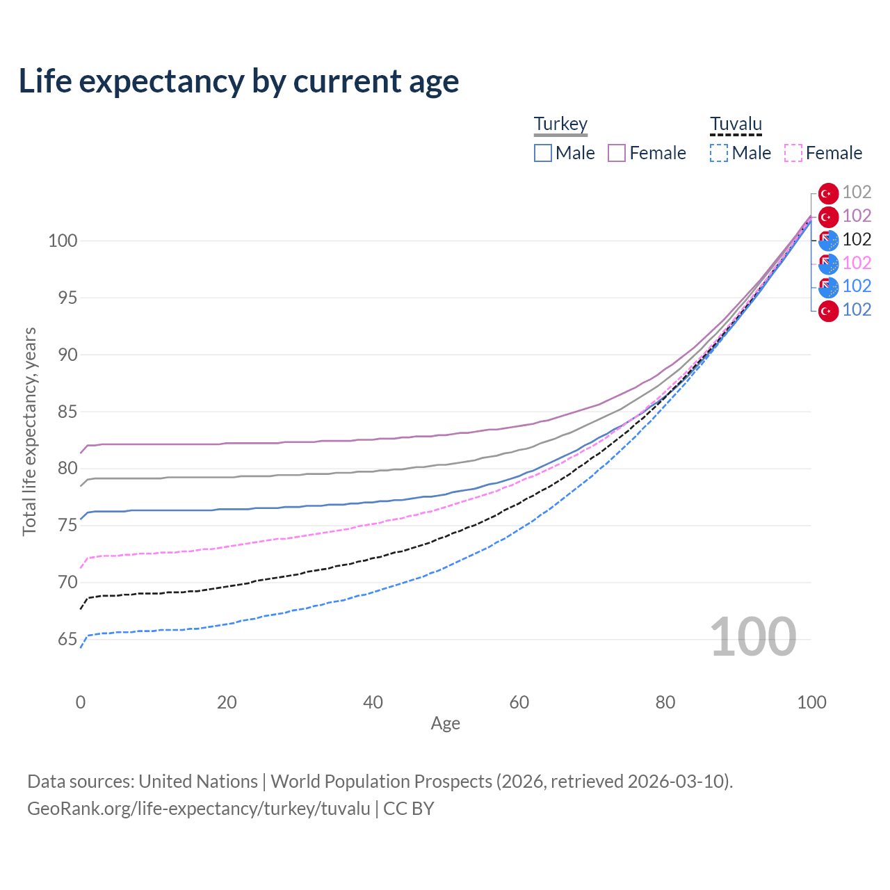 This life expectancy calculator shows the odds of living to 100, 95, 90, and below based on current age for both males and females in Turkey and Tuvalu, along with mean and median age of death. The calculations are based on the 2026 life tables (actuarial tables) from the UN World Population Prospects.