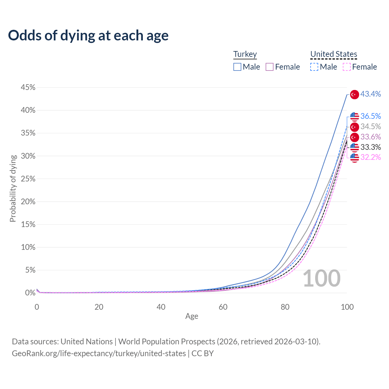 This life expectancy calculator shows the odds of living to 100, 95, 90, and below based on current age for both males and females in Turkey and the United States, along with mean and median age of death. The calculations are based on the 2026 life tables (actuarial tables) from the UN World Population Prospects.