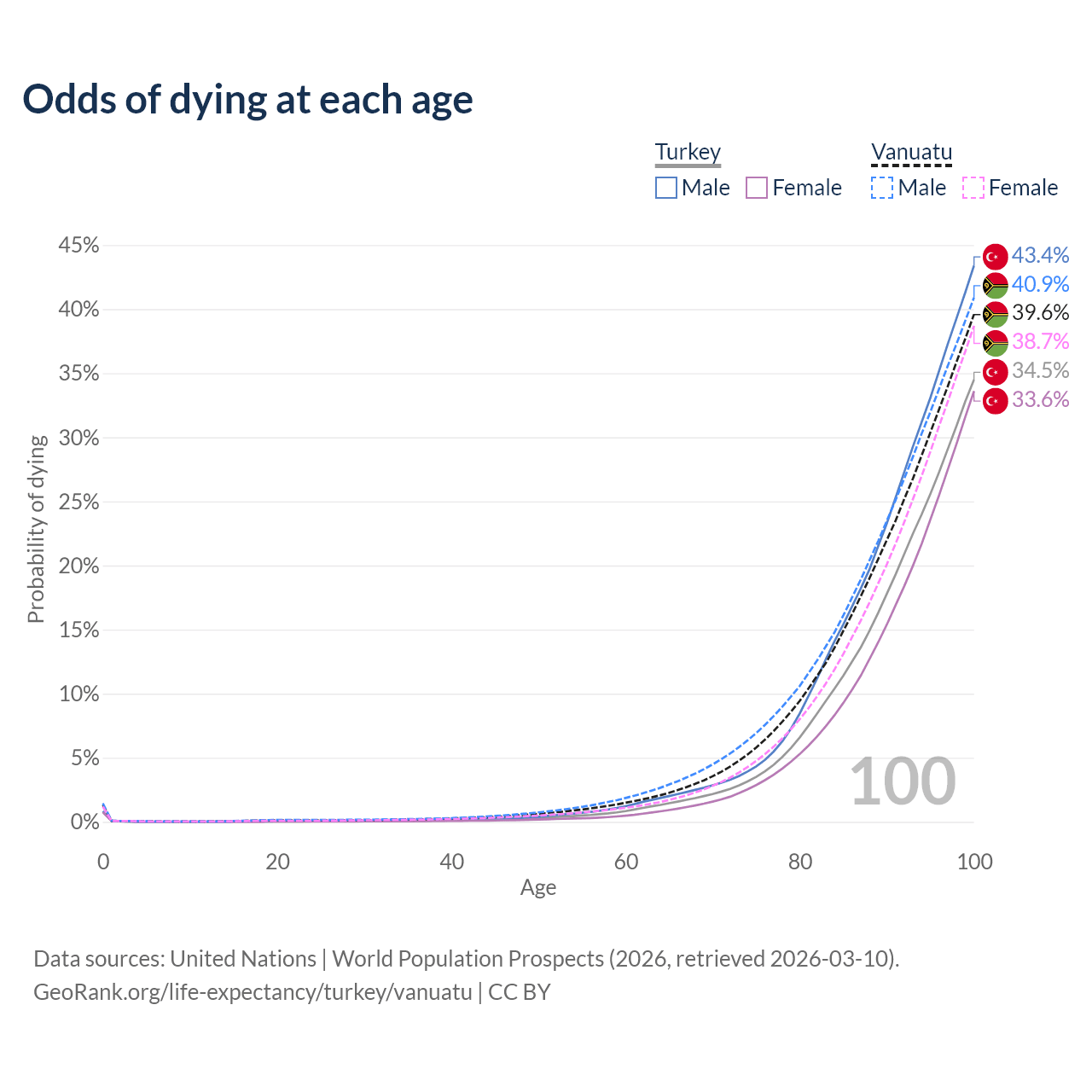 This life expectancy calculator shows the odds of living to 100, 95, 90, and below based on current age for both males and females in Turkey and Vanuatu, along with mean and median age of death. The calculations are based on the 2026 life tables (actuarial tables) from the UN World Population Prospects.