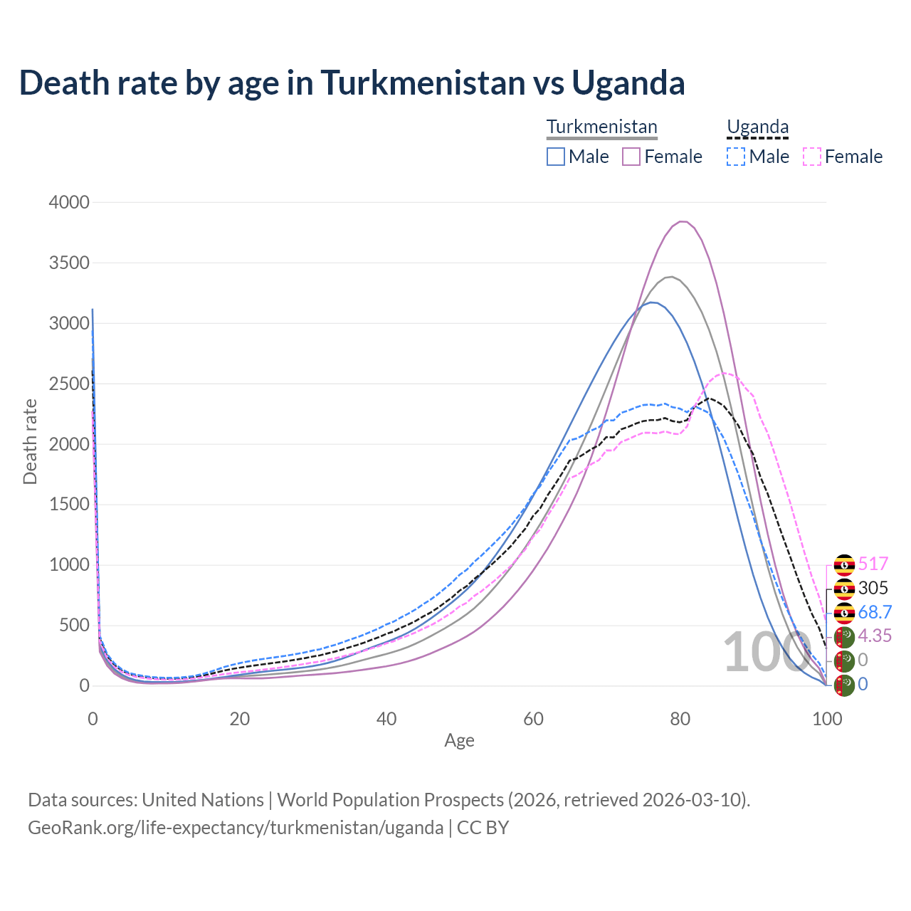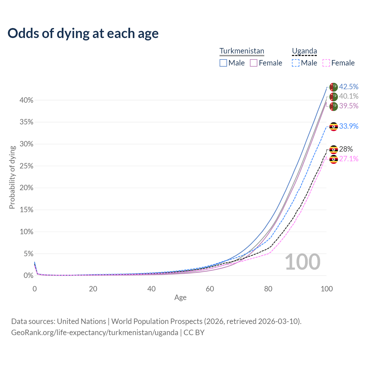 This life expectancy calculator shows the odds of living to 100, 95, 90, and below based on current age for both males and females in Turkmenistan and Uganda, along with mean and median age of death. The calculations are based on the 2026 life tables (actuarial tables) from the UN World Population Prospects.