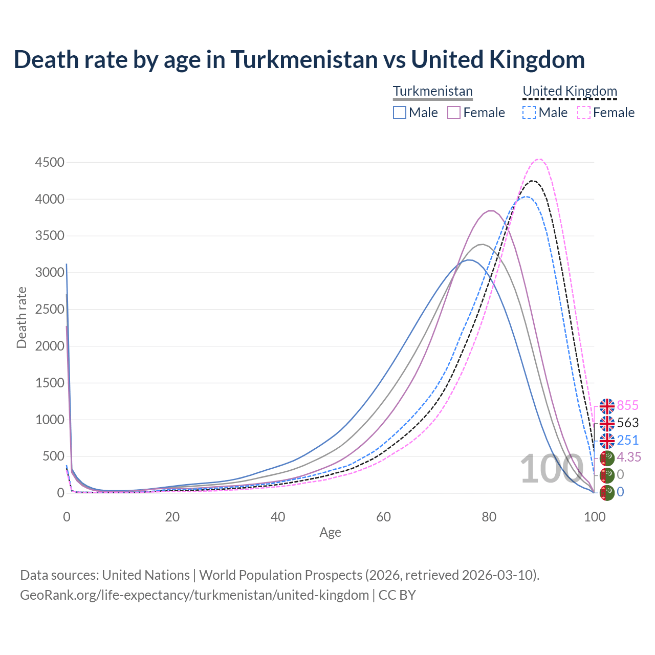 In Turkmenistan, the most common age of death is 79, compared to 88 in the United Kingdom. The median age of death is 75.1 in Turkmenistan and 84.9 in the United Kingdom, meaning only half of each cohort is expected to live past that age.