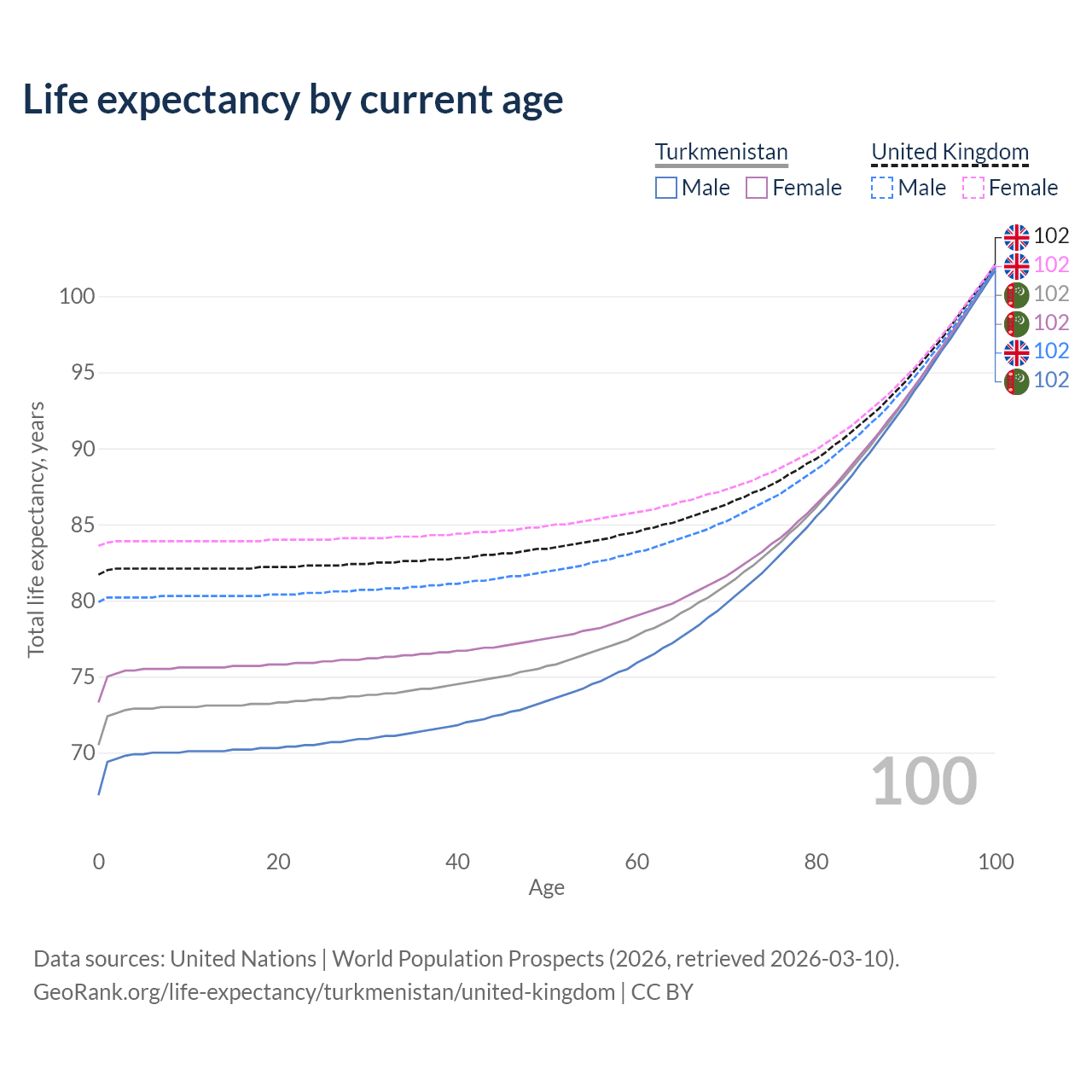 This life expectancy calculator shows the odds of living to 100, 95, 90, and below based on current age for both males and females in Turkmenistan and the United Kingdom, along with mean and median age of death. The calculations are based on the 2026 life tables (actuarial tables) from the UN World Population Prospects.