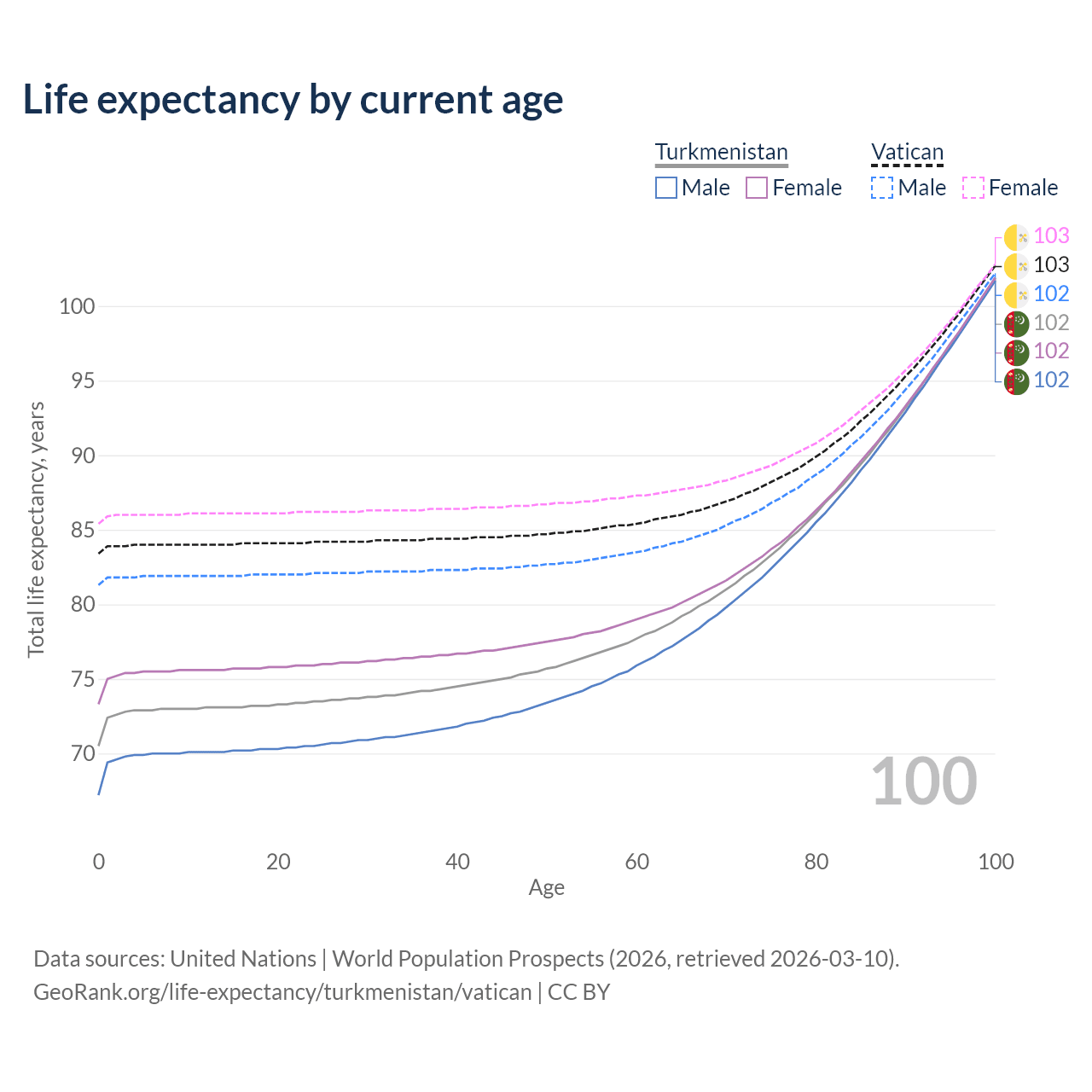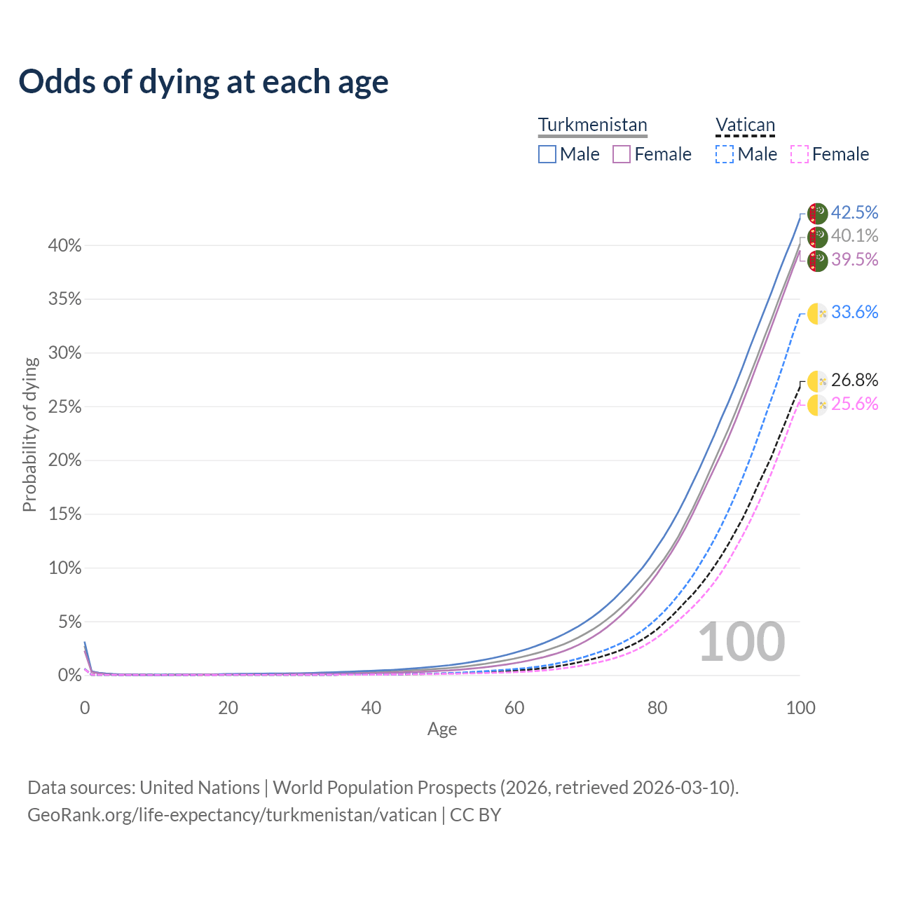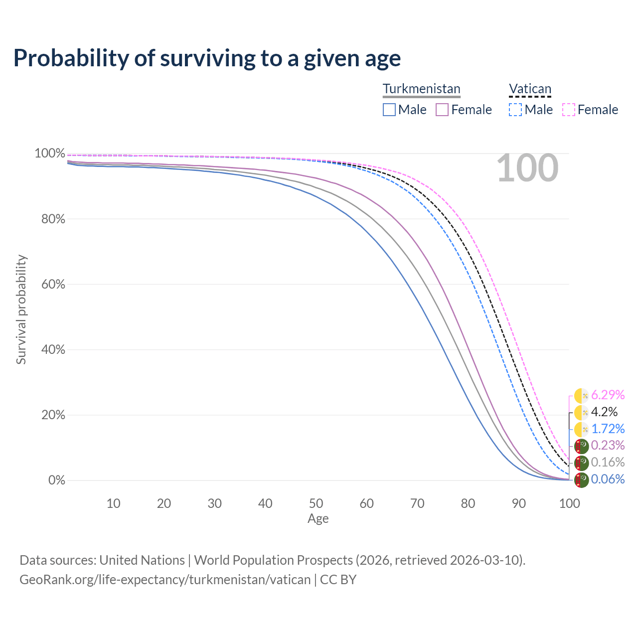 This life expectancy calculator shows the odds of living to 100, 95, 90, and below based on current age for both males and females in Turkmenistan and the Vatican, along with mean and median age of death. The calculations are based on the 2026 life tables (actuarial tables) from the UN World Population Prospects.