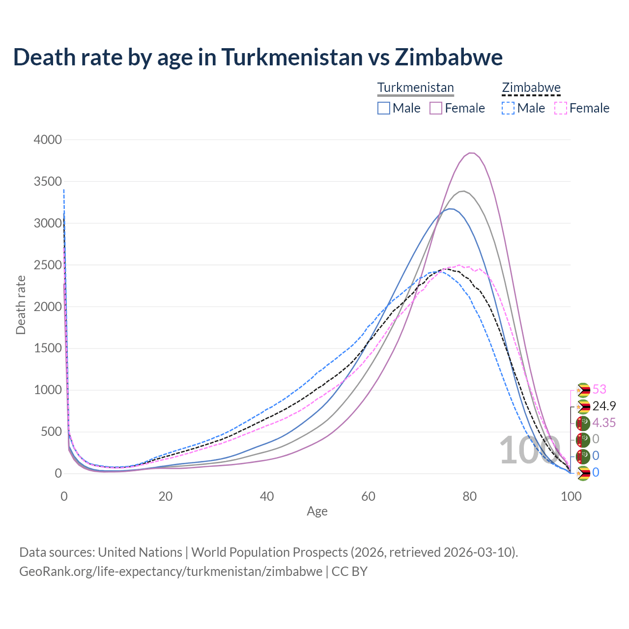In Turkmenistan, the most common age of death is 79, compared to 0 in Zimbabwe. The median age of death is 75.1 in Turkmenistan and 68.8 in Zimbabwe, meaning only half of each cohort is expected to live past that age.
