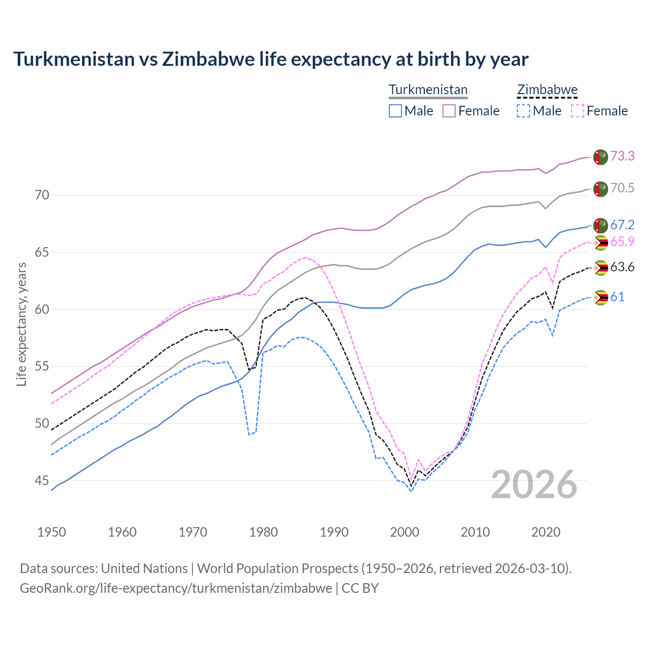 The average life expectancy at birth is 70.5 years in Turkmenistan vs 63.6 in Zimbabwe. Turkmenistan is ranked 135/197 by life expectancy, and Zimbabwe is 180/197. In Turkmenistan, the life expectancy is 67.2 years for males and 73.3 years for females. In Zimbabwe, it's 61 years for males and 65.9 years for females.