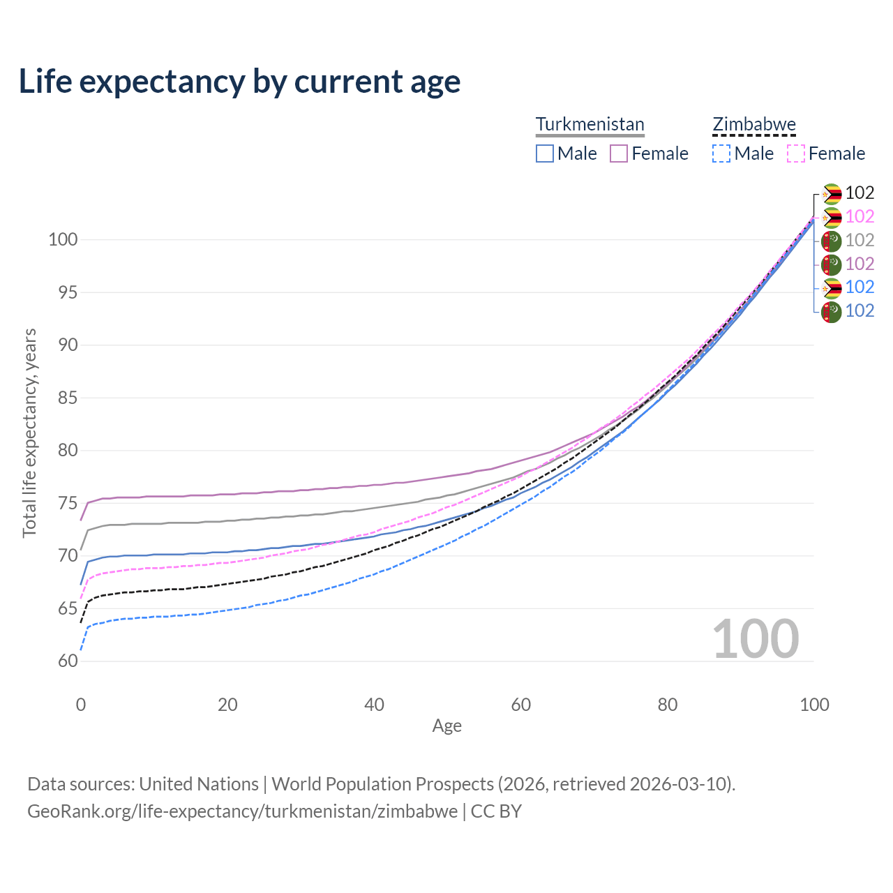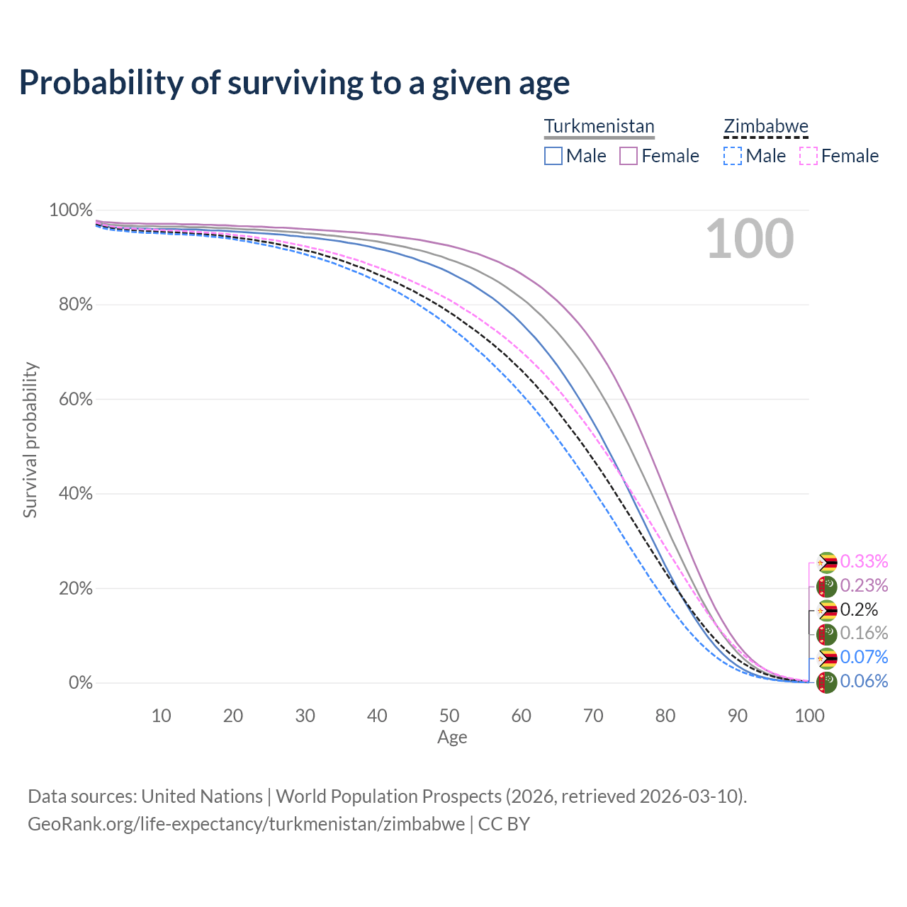 This life expectancy calculator shows the odds of living to 100, 95, 90, and below based on current age for both males and females in Turkmenistan and Zimbabwe, along with mean and median age of death. The calculations are based on the 2026 life tables (actuarial tables) from the UN World Population Prospects.