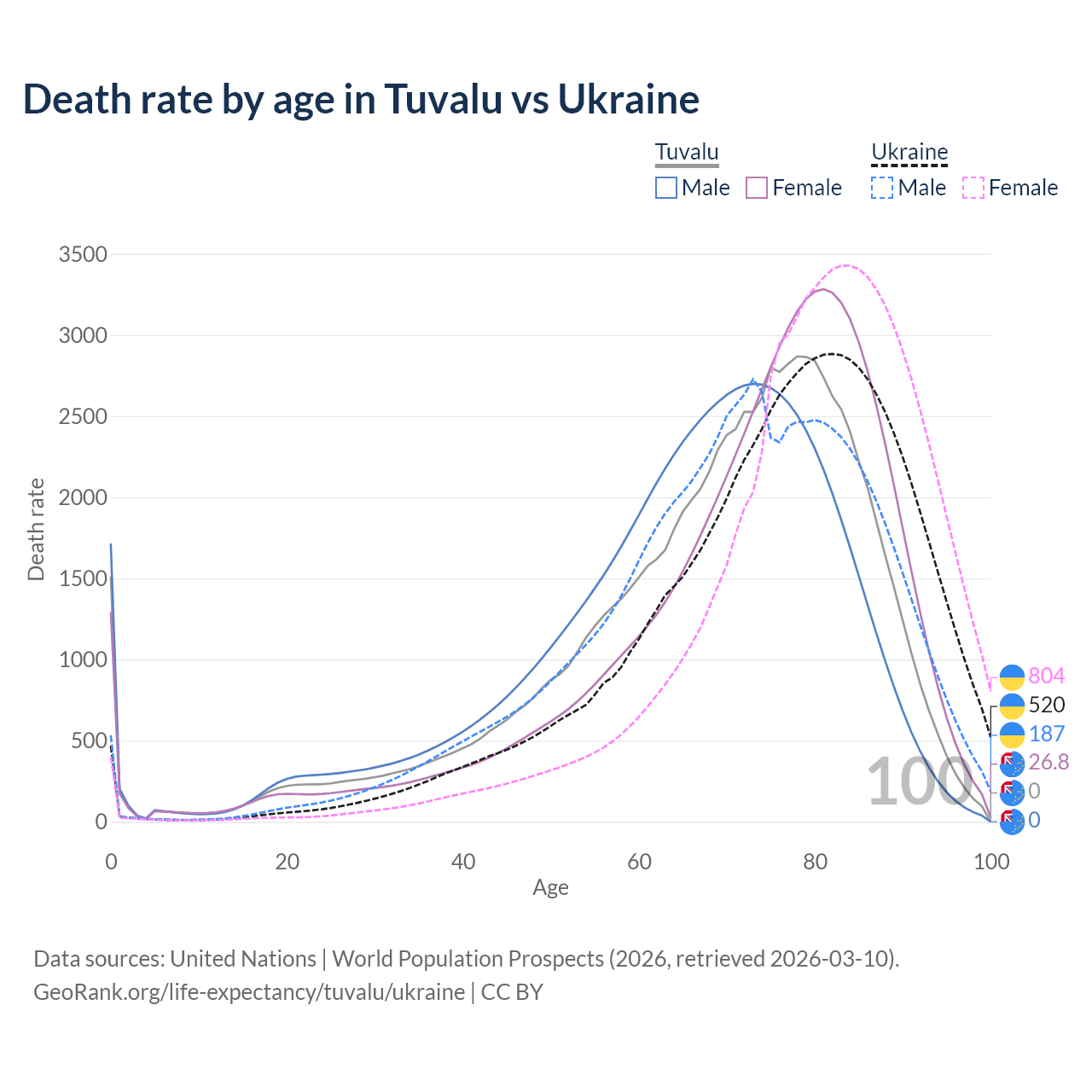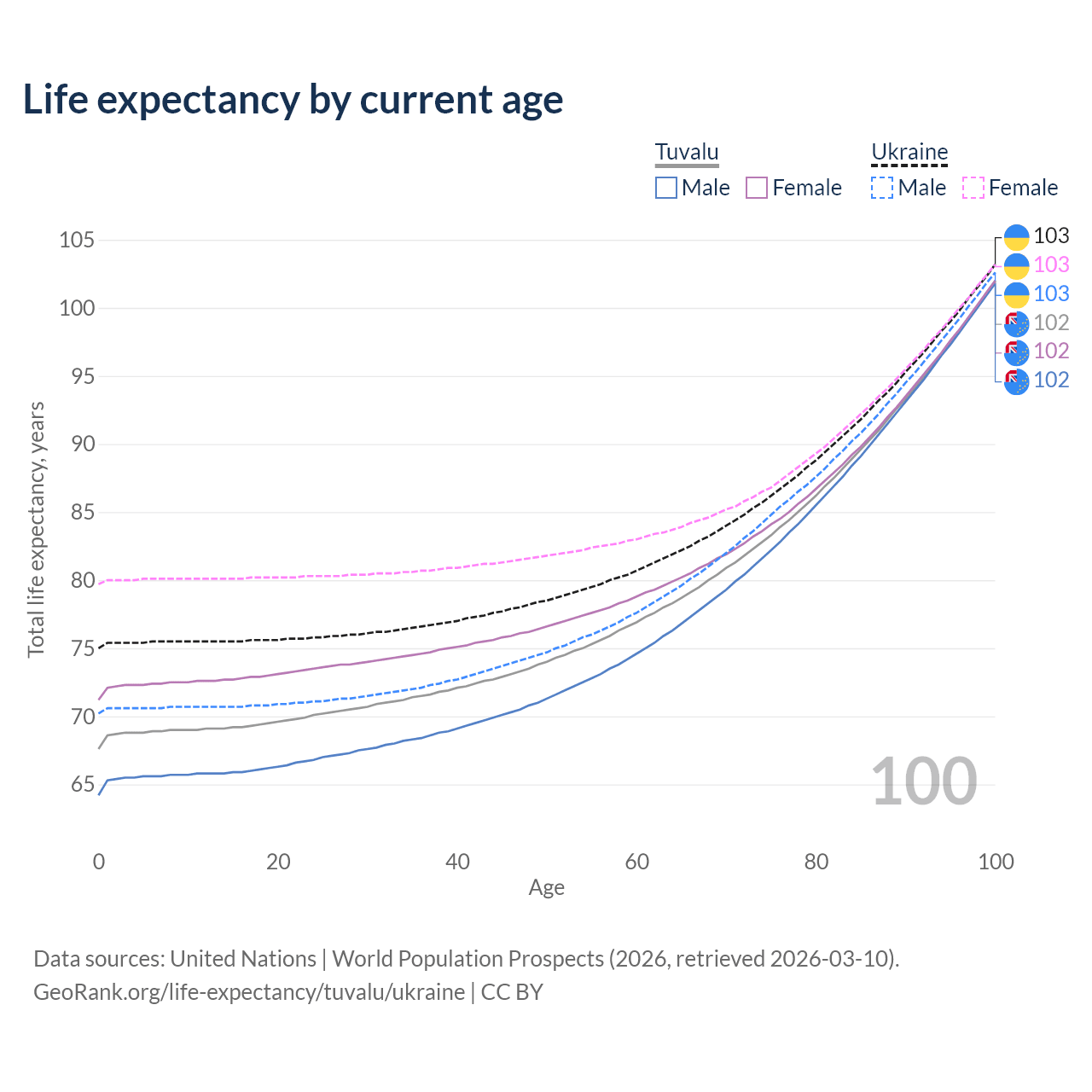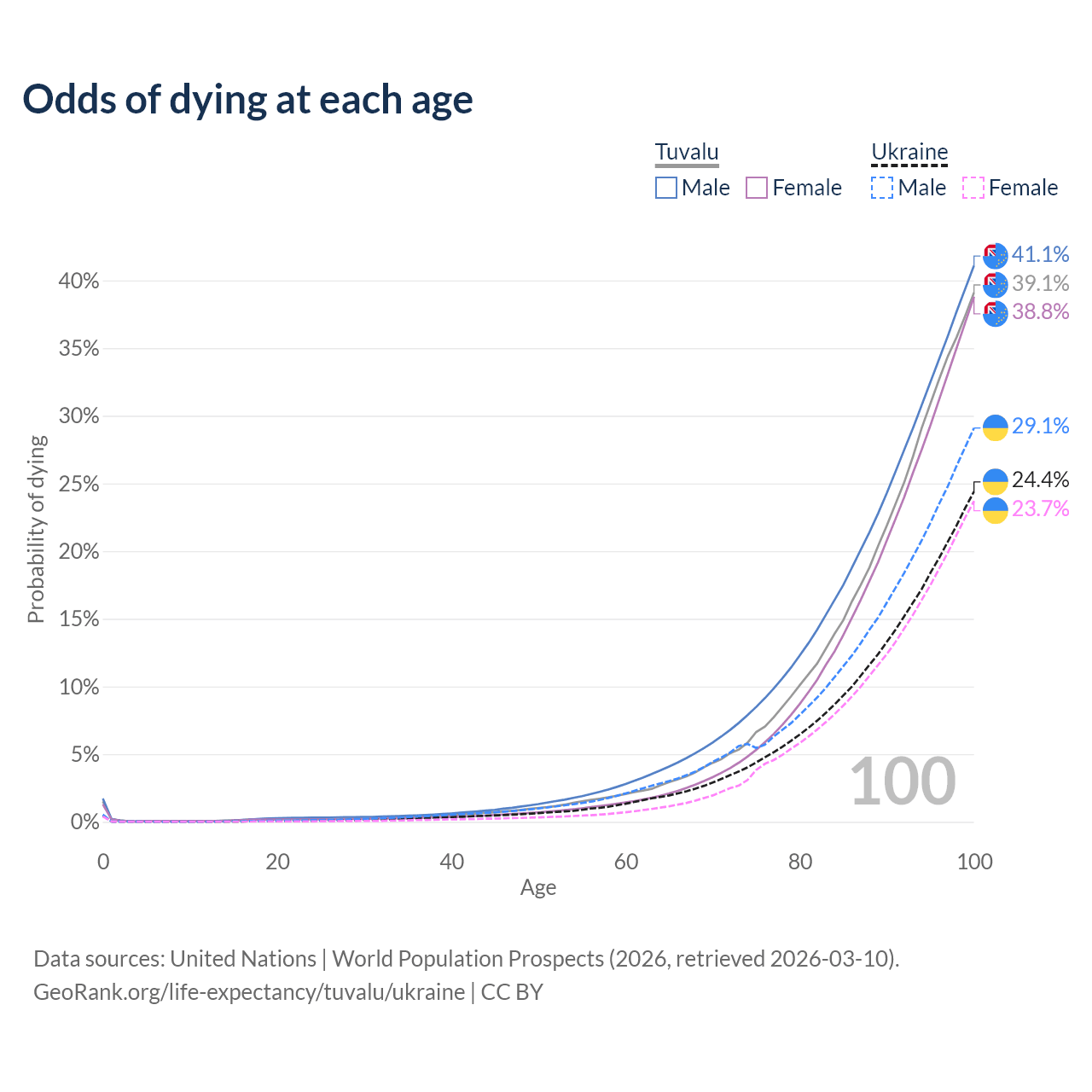 This life expectancy calculator shows the odds of living to 100, 95, 90, and below based on current age for both males and females in Tuvalu and Ukraine, along with mean and median age of death. The calculations are based on the 2026 life tables (actuarial tables) from the UN World Population Prospects.