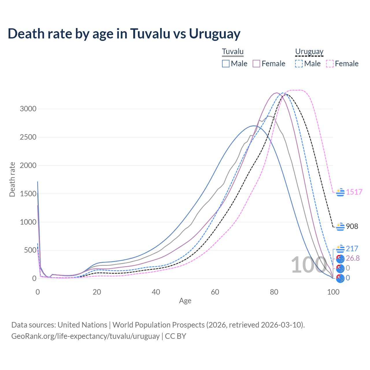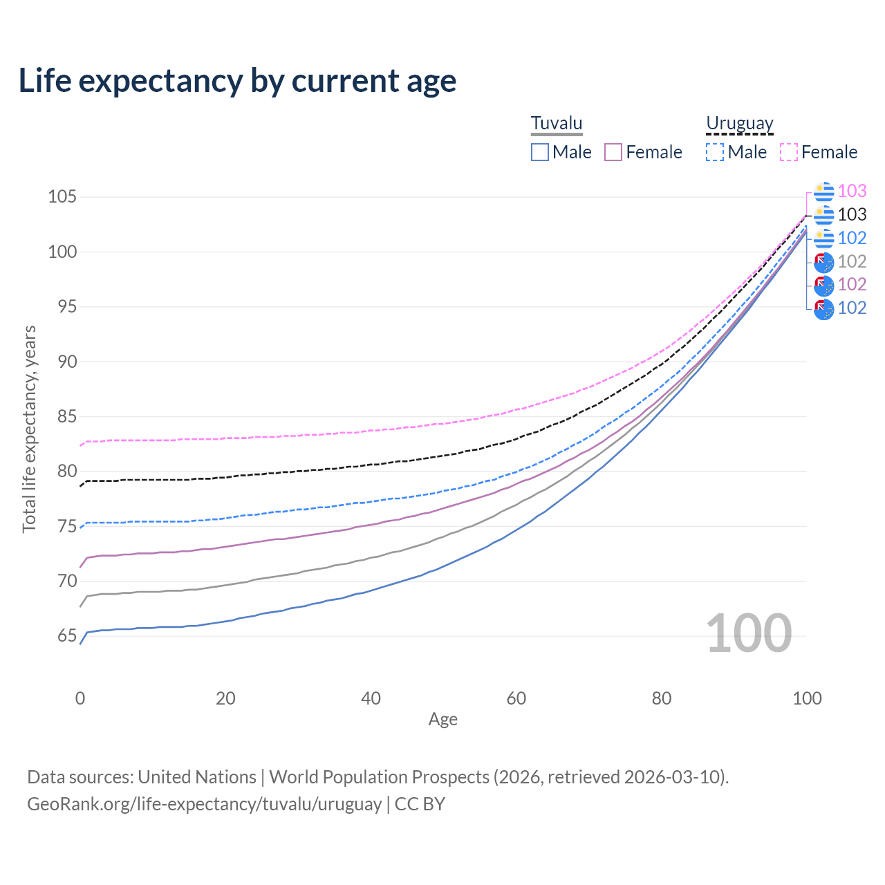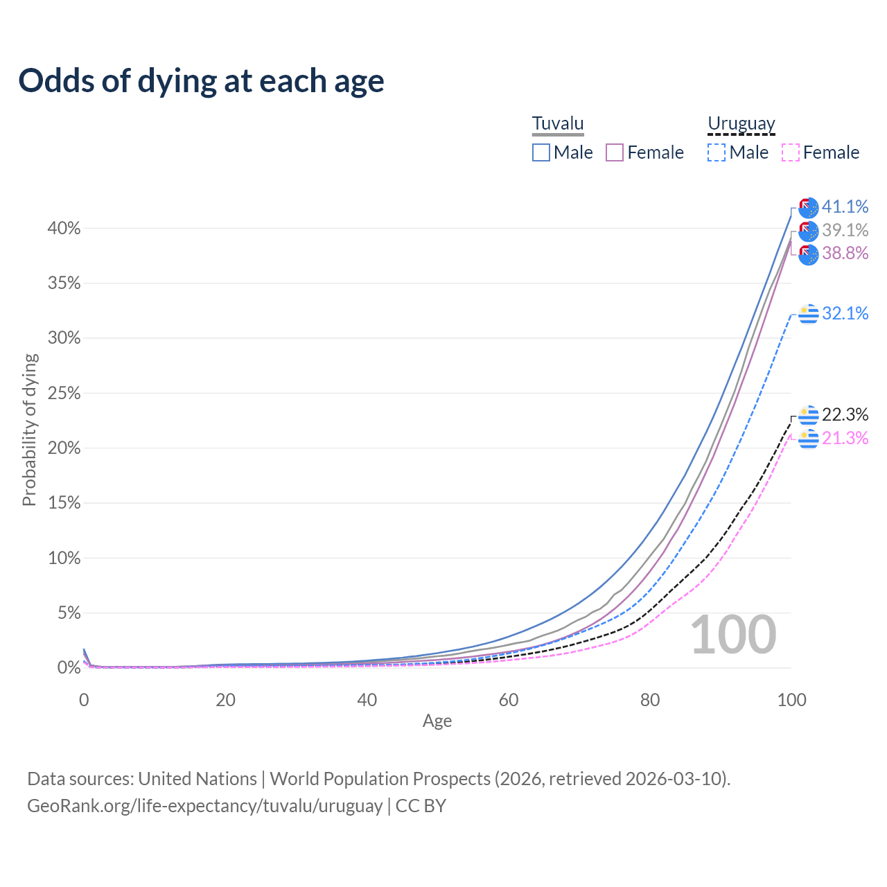 This life expectancy calculator shows the odds of living to 100, 95, 90, and below based on current age for both males and females in Tuvalu and Uruguay, along with mean and median age of death. The calculations are based on the 2026 life tables (actuarial tables) from the UN World Population Prospects.