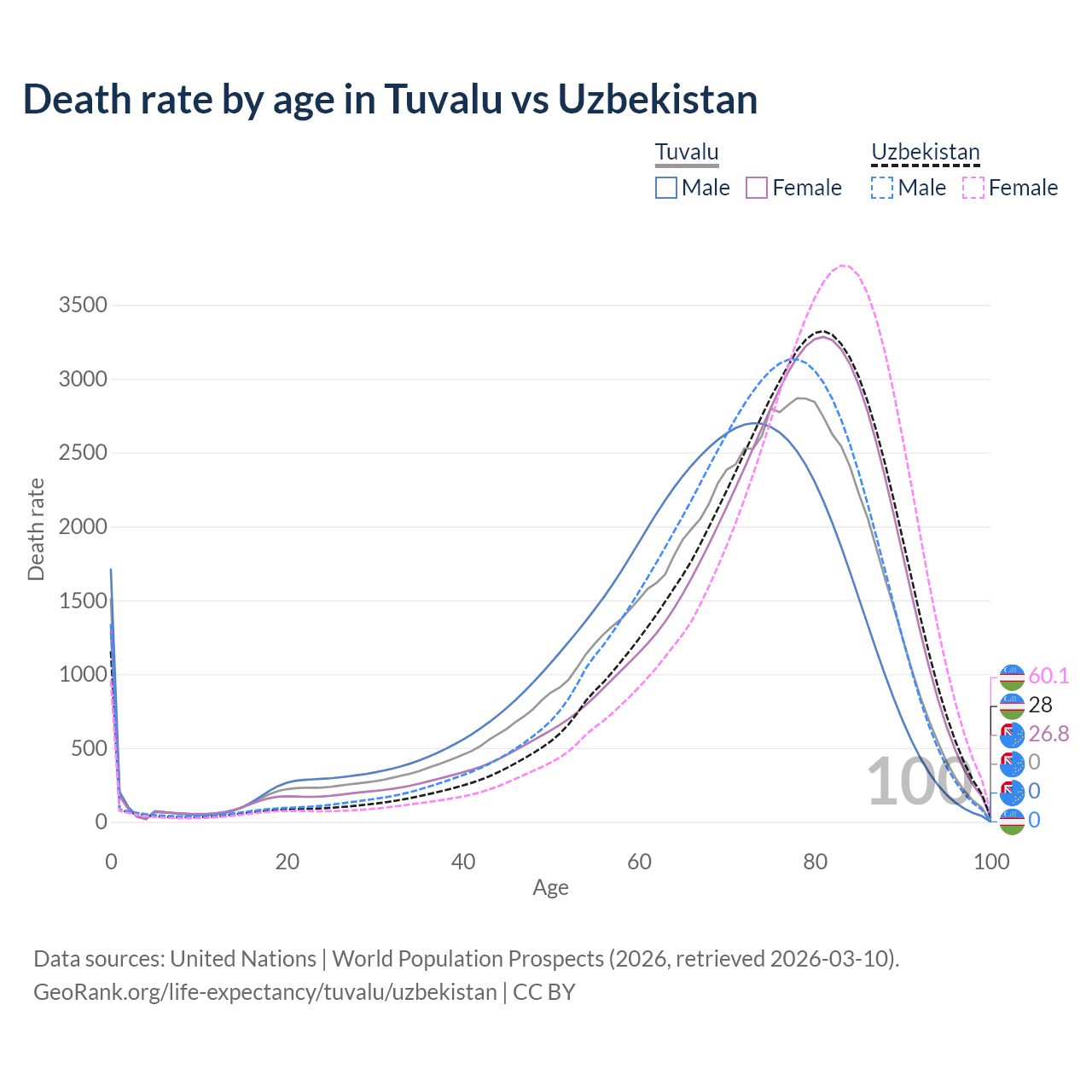 This life expectancy calculator shows the odds of living to 100, 95, 90, and below based on current age for both males and females in Tuvalu and Uzbekistan, along with mean and median age of death. The calculations are based on the 2026 life tables (actuarial tables) from the UN World Population Prospects.