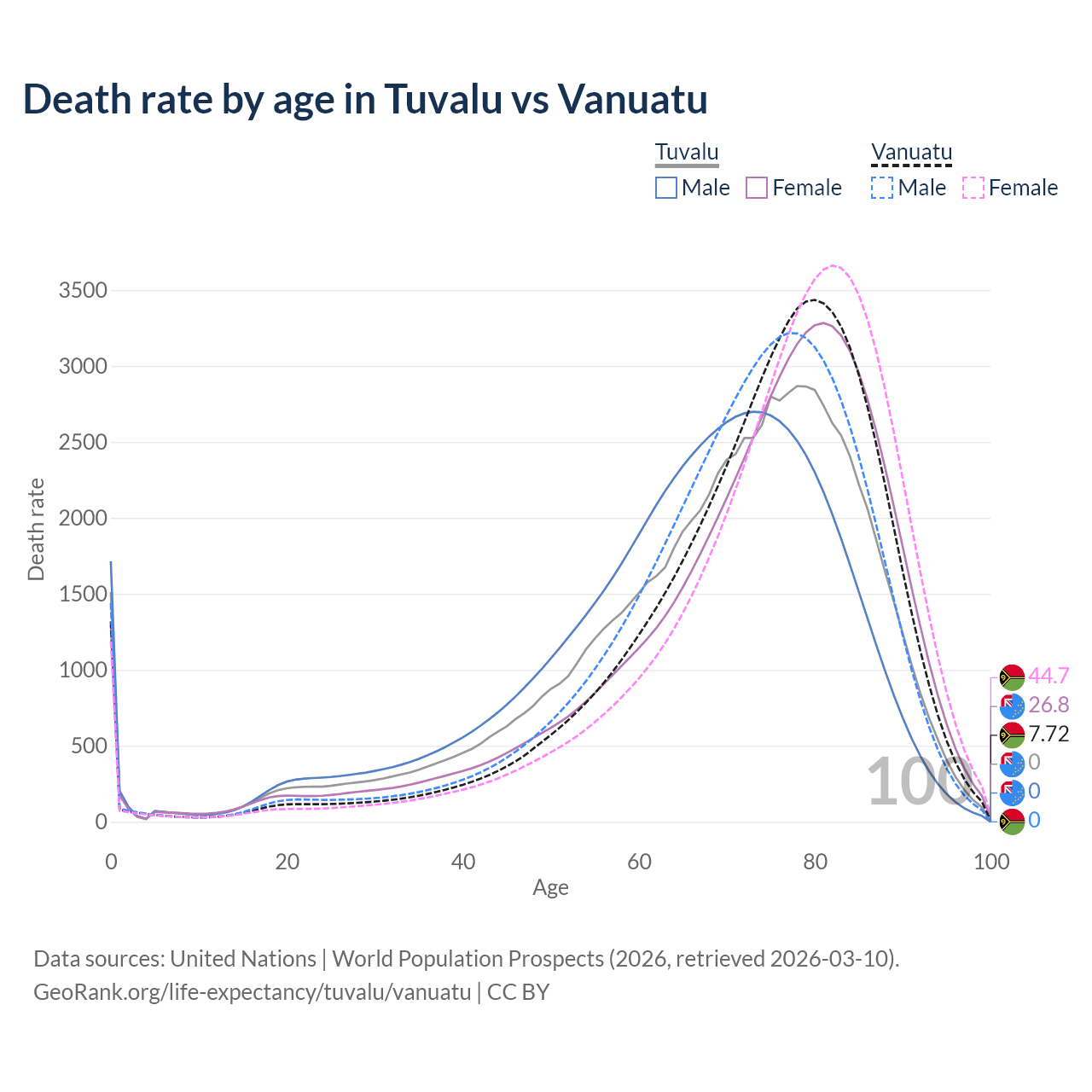 In Tuvalu, the most common age of death is 78, compared to 80 in Vanuatu. The median age of death is 71.9 in Tuvalu and 75.9 in Vanuatu, meaning only half of each cohort is expected to live past that age.