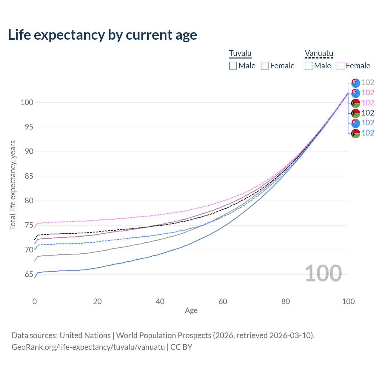 This life expectancy calculator shows the odds of living to 100, 95, 90, and below based on current age for both males and females in Tuvalu and Vanuatu, along with mean and median age of death. The calculations are based on the 2026 life tables (actuarial tables) from the UN World Population Prospects.