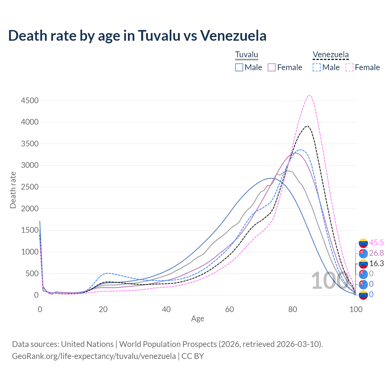 In Tuvalu, the most common age of death is 78, compared to 85 in Venezuela. The median age of death is 71.9 in Tuvalu and 79 in Venezuela, meaning only half of each cohort is expected to live past that age.
