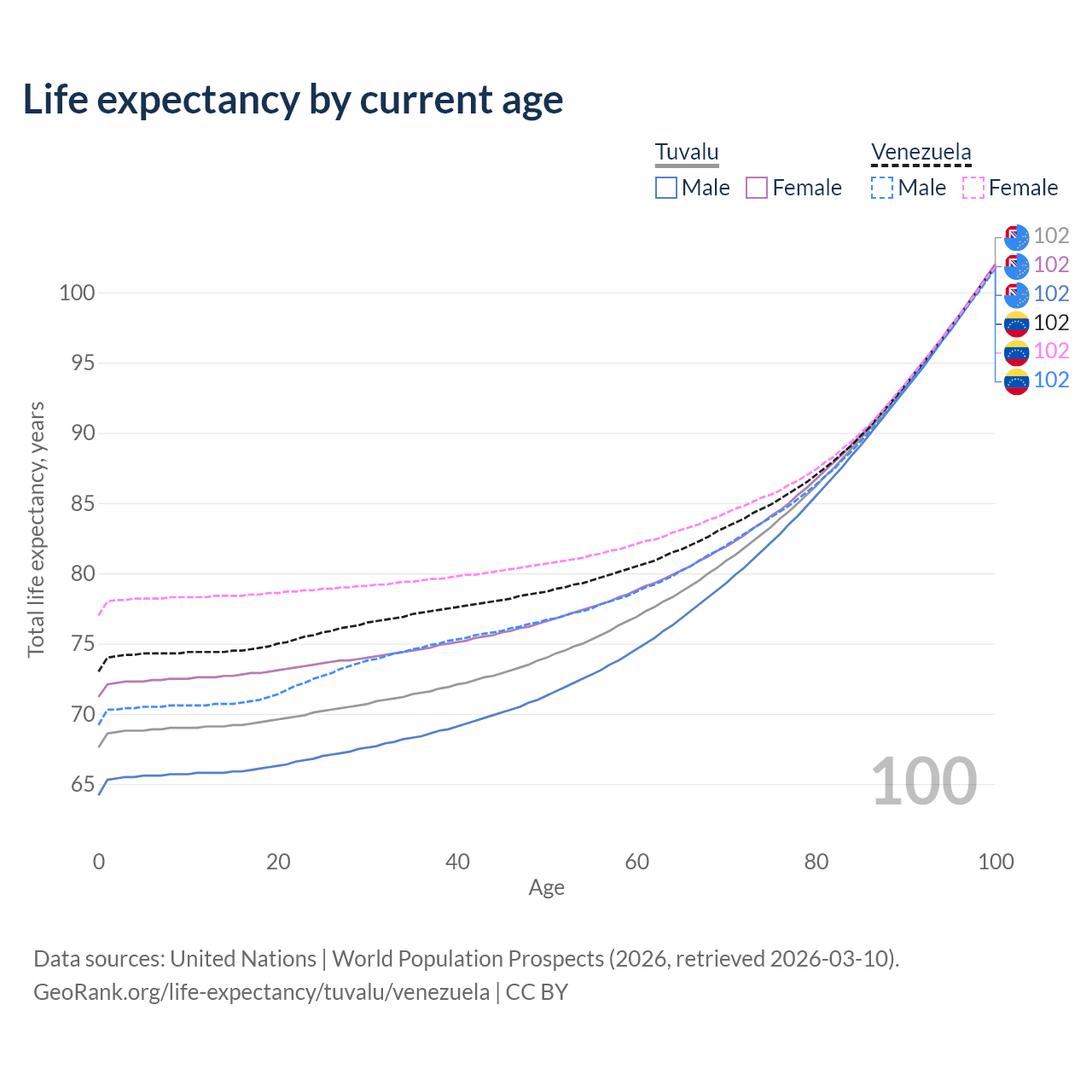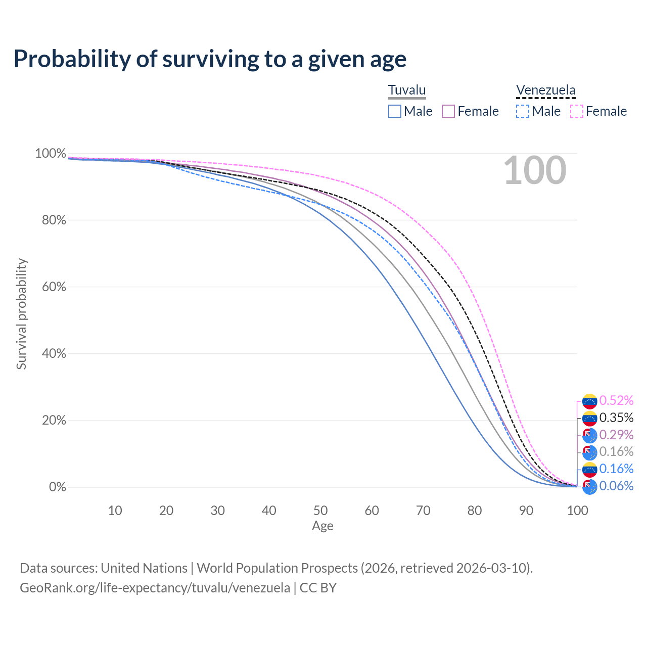 This life expectancy calculator shows the odds of living to 100, 95, 90, and below based on current age for both males and females in Tuvalu and Venezuela, along with mean and median age of death. The calculations are based on the 2026 life tables (actuarial tables) from the UN World Population Prospects.