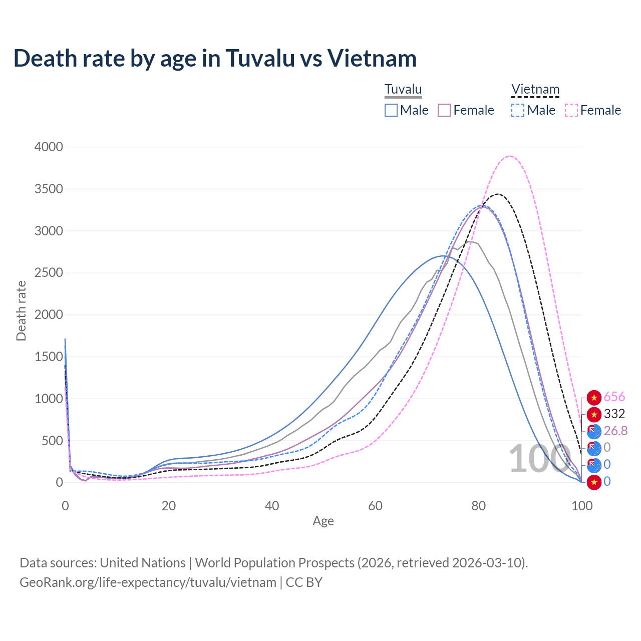 In Tuvalu, the most common age of death is 78, compared to 84 in Vietnam. The median age of death is 71.9 in Tuvalu and 79.9 in Vietnam, meaning only half of each cohort is expected to live past that age.