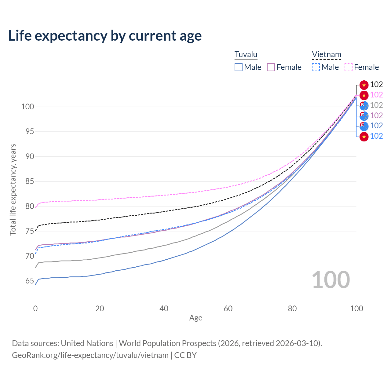 This life expectancy calculator shows the odds of living to 100, 95, 90, and below based on current age for both males and females in Tuvalu and Vietnam, along with mean and median age of death. The calculations are based on the 2026 life tables (actuarial tables) from the UN World Population Prospects.