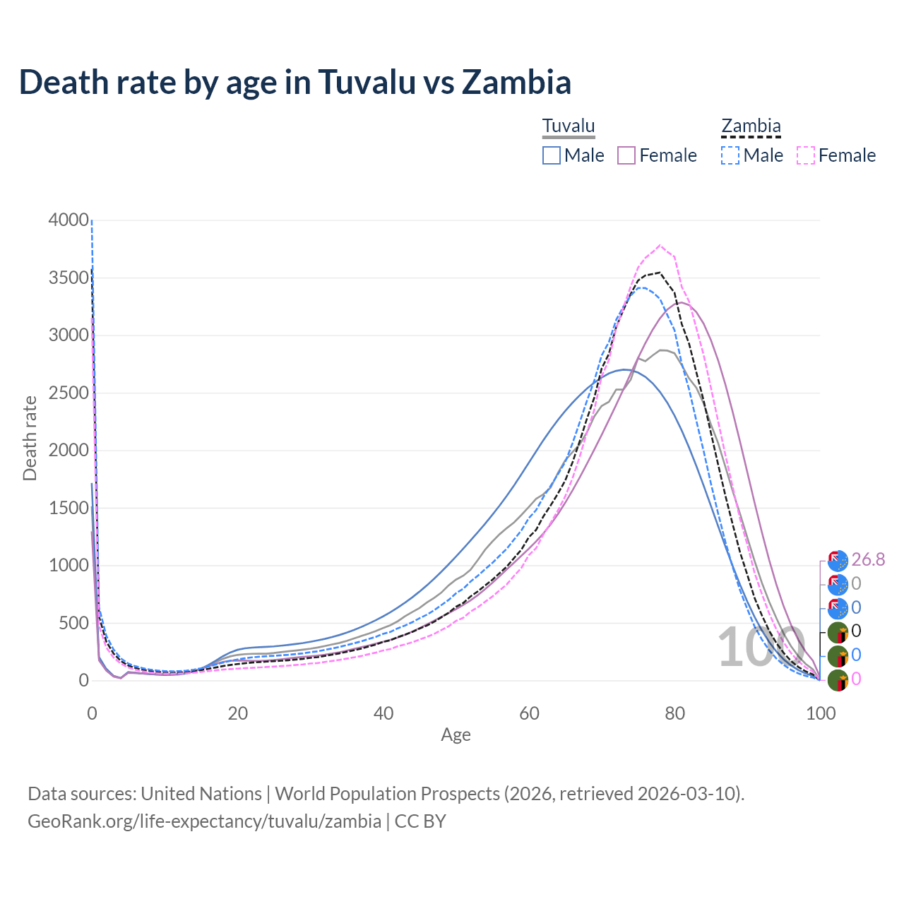 In Tuvalu, the most common age of death is 78, compared to 0 in Zambia. The median age of death is 71.9 in Tuvalu and 73.1 in Zambia, meaning only half of each cohort is expected to live past that age.
