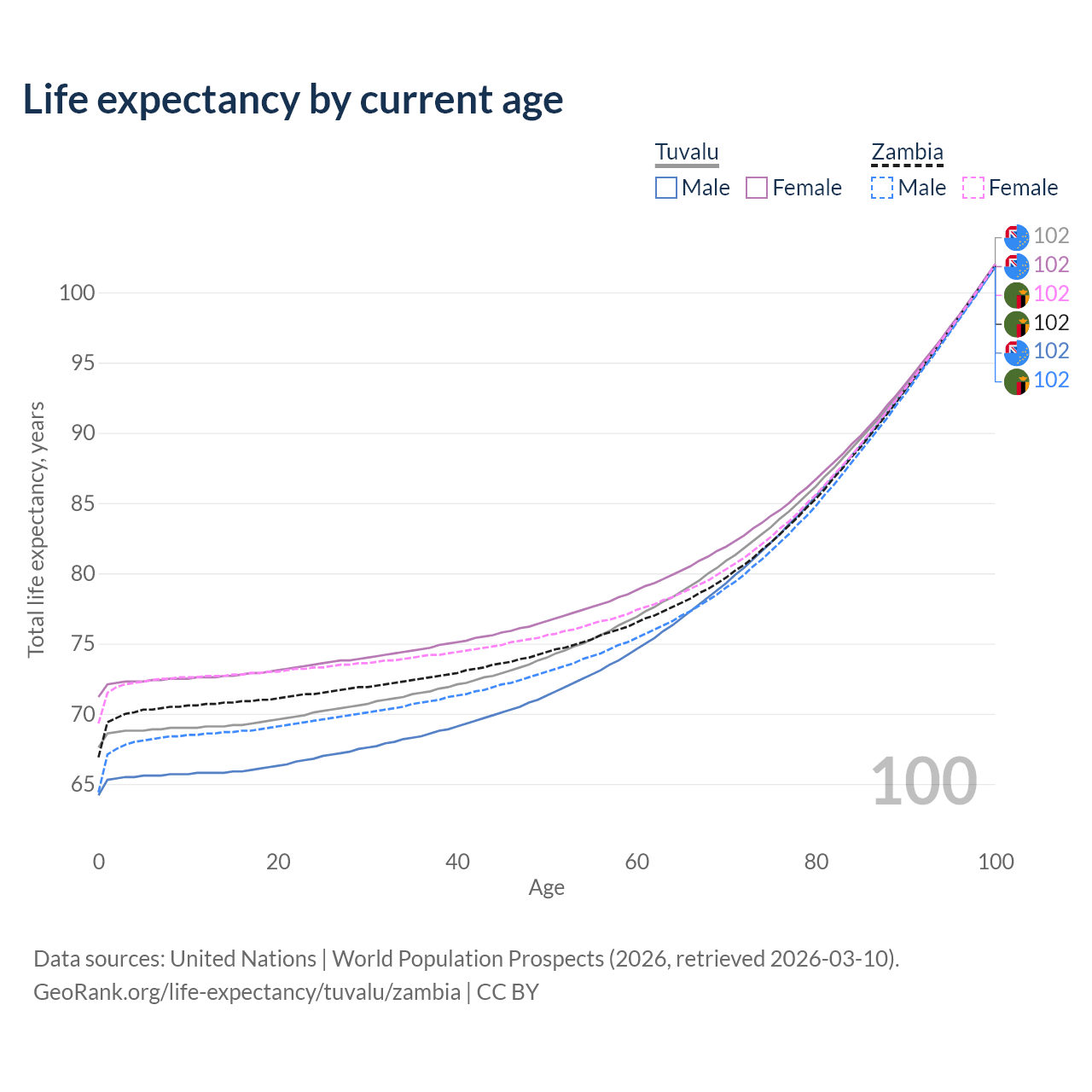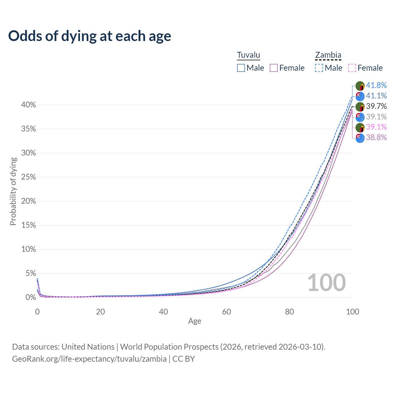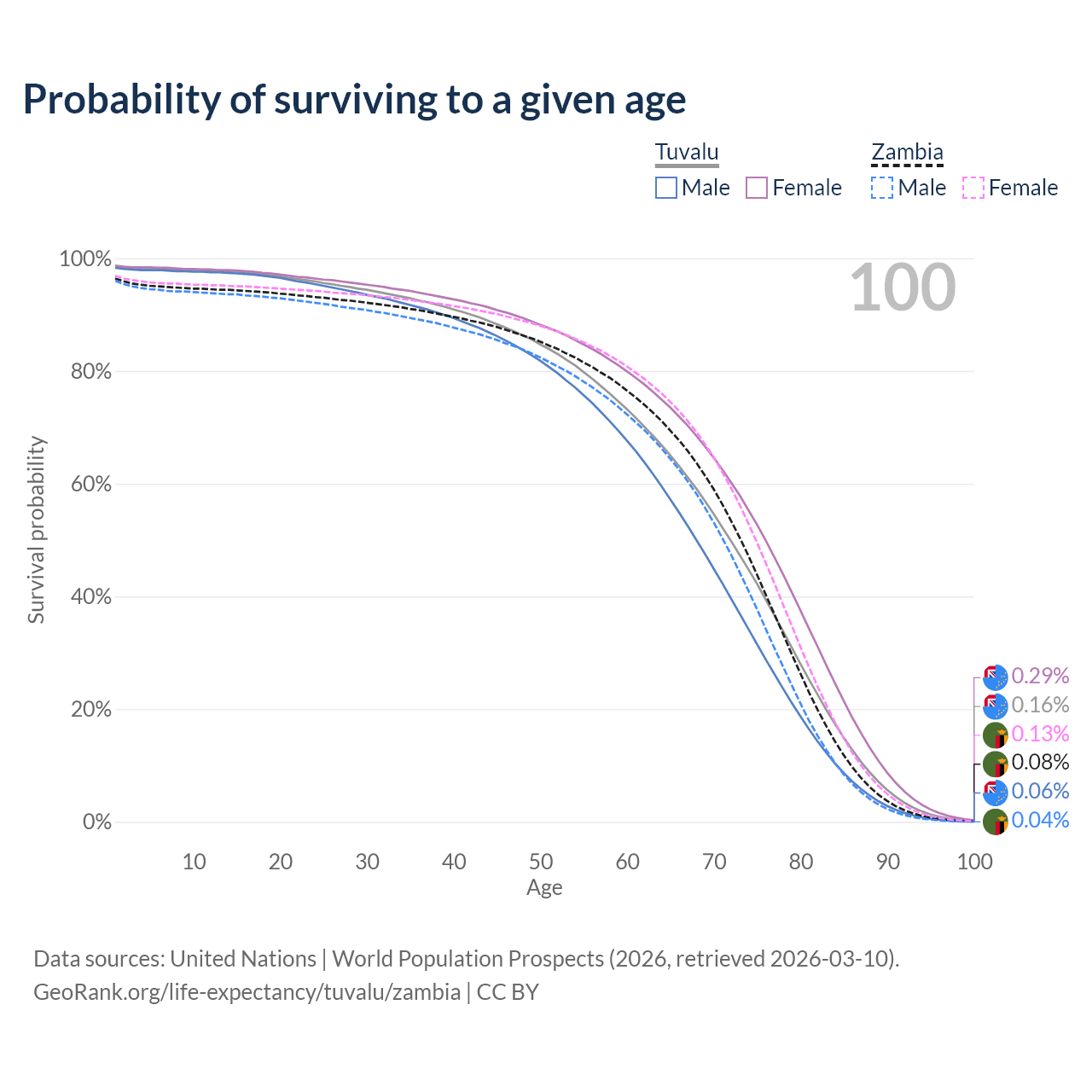 This life expectancy calculator shows the odds of living to 100, 95, 90, and below based on current age for both males and females in Tuvalu and Zambia, along with mean and median age of death. The calculations are based on the 2026 life tables (actuarial tables) from the UN World Population Prospects.