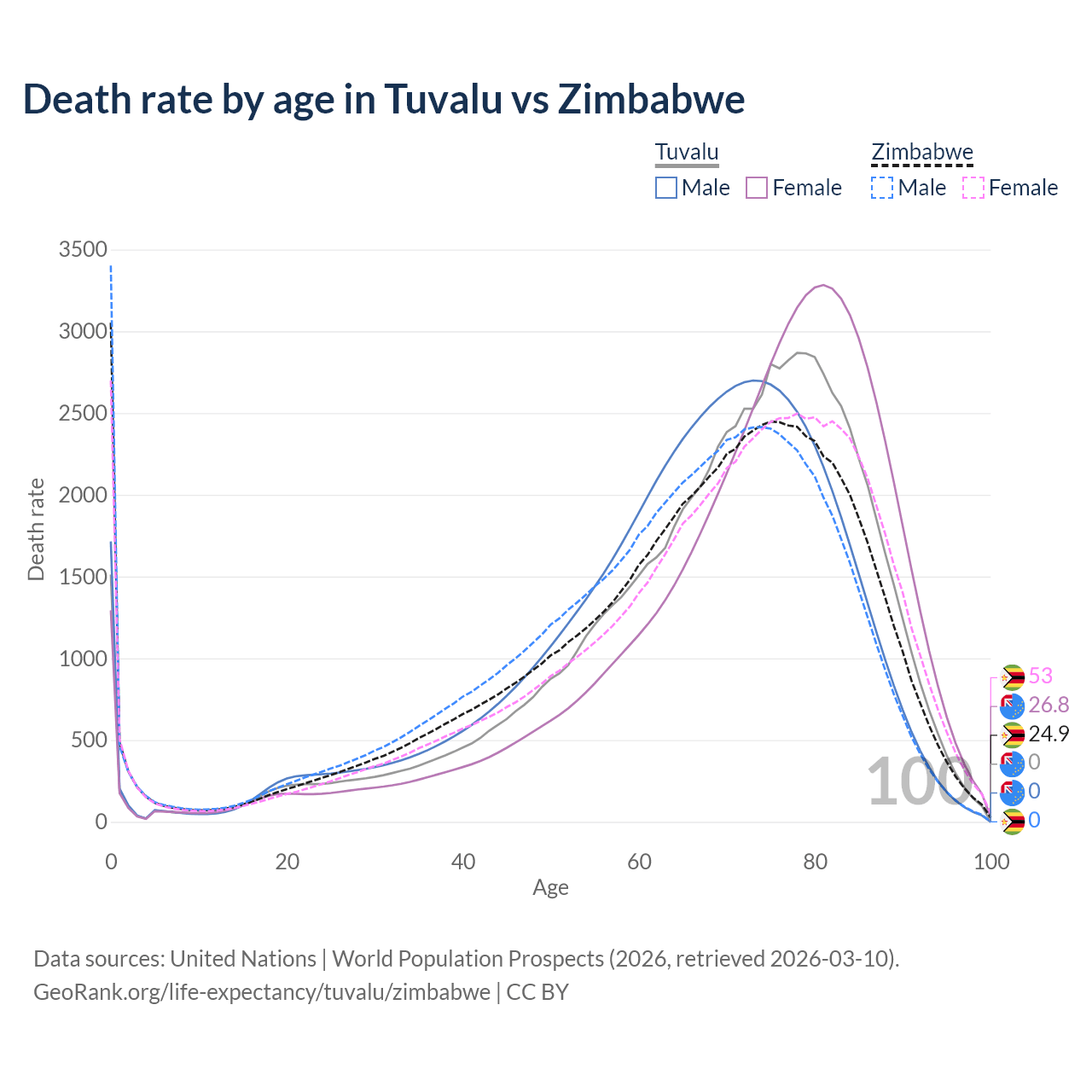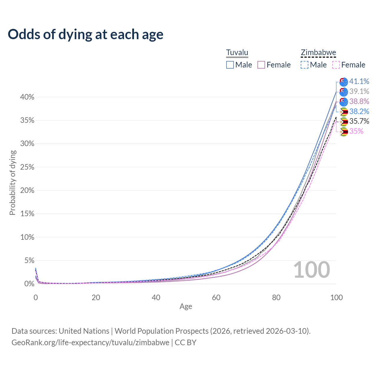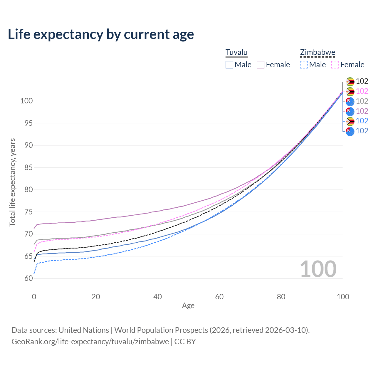 This life expectancy calculator shows the odds of living to 100, 95, 90, and below based on current age for both males and females in Tuvalu and Zimbabwe, along with mean and median age of death. The calculations are based on the 2026 life tables (actuarial tables) from the UN World Population Prospects.