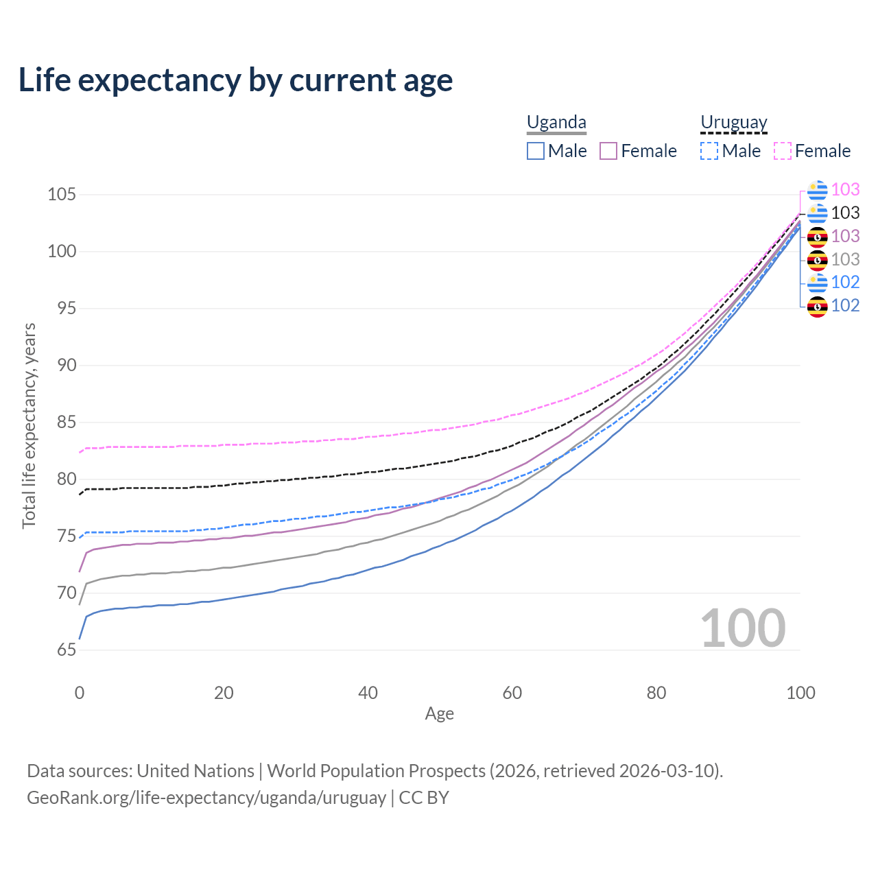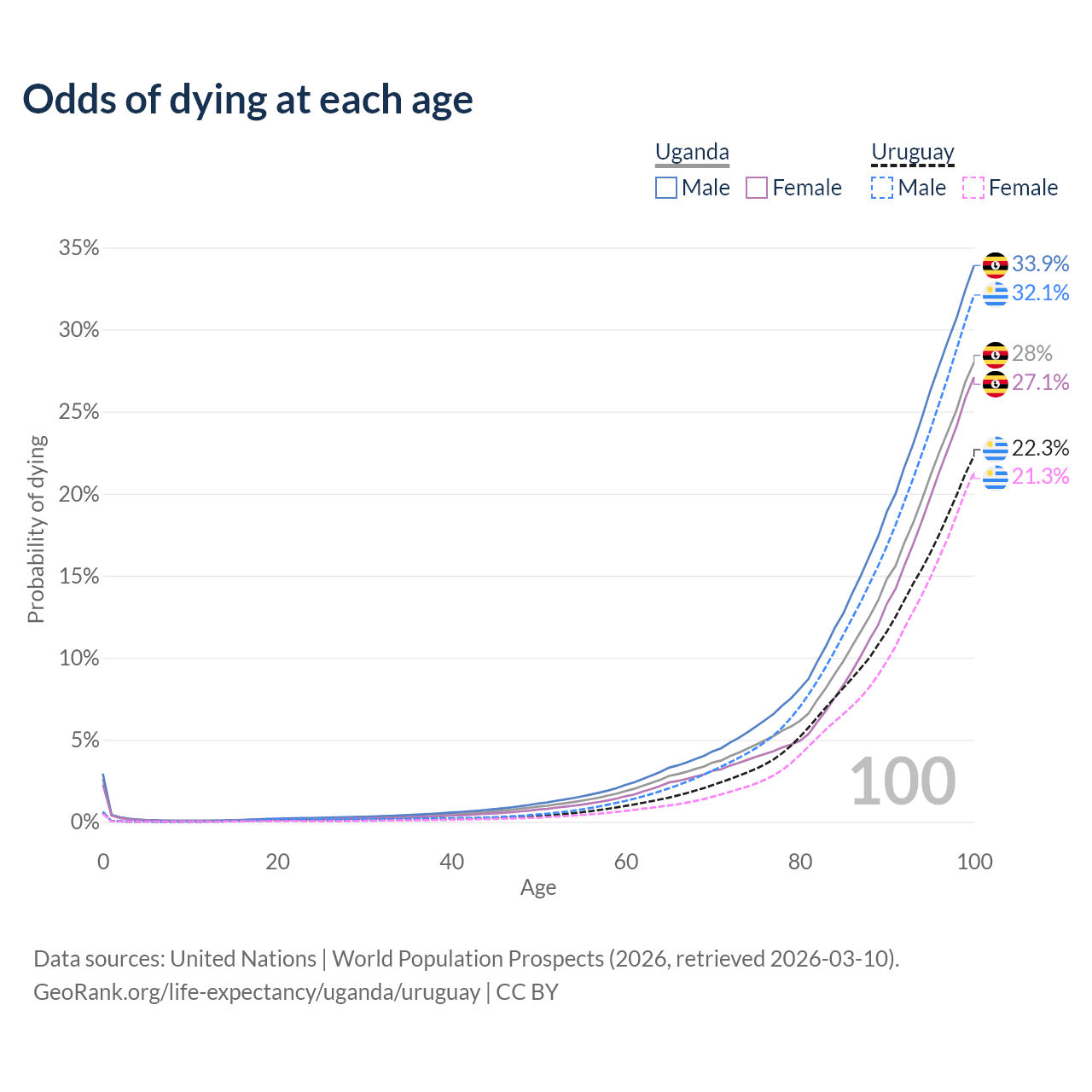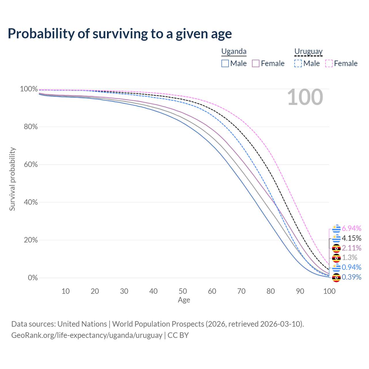 This life expectancy calculator shows the odds of living to 100, 95, 90, and below based on current age for both males and females in Uganda and Uruguay, along with mean and median age of death. The calculations are based on the 2026 life tables (actuarial tables) from the UN World Population Prospects.
