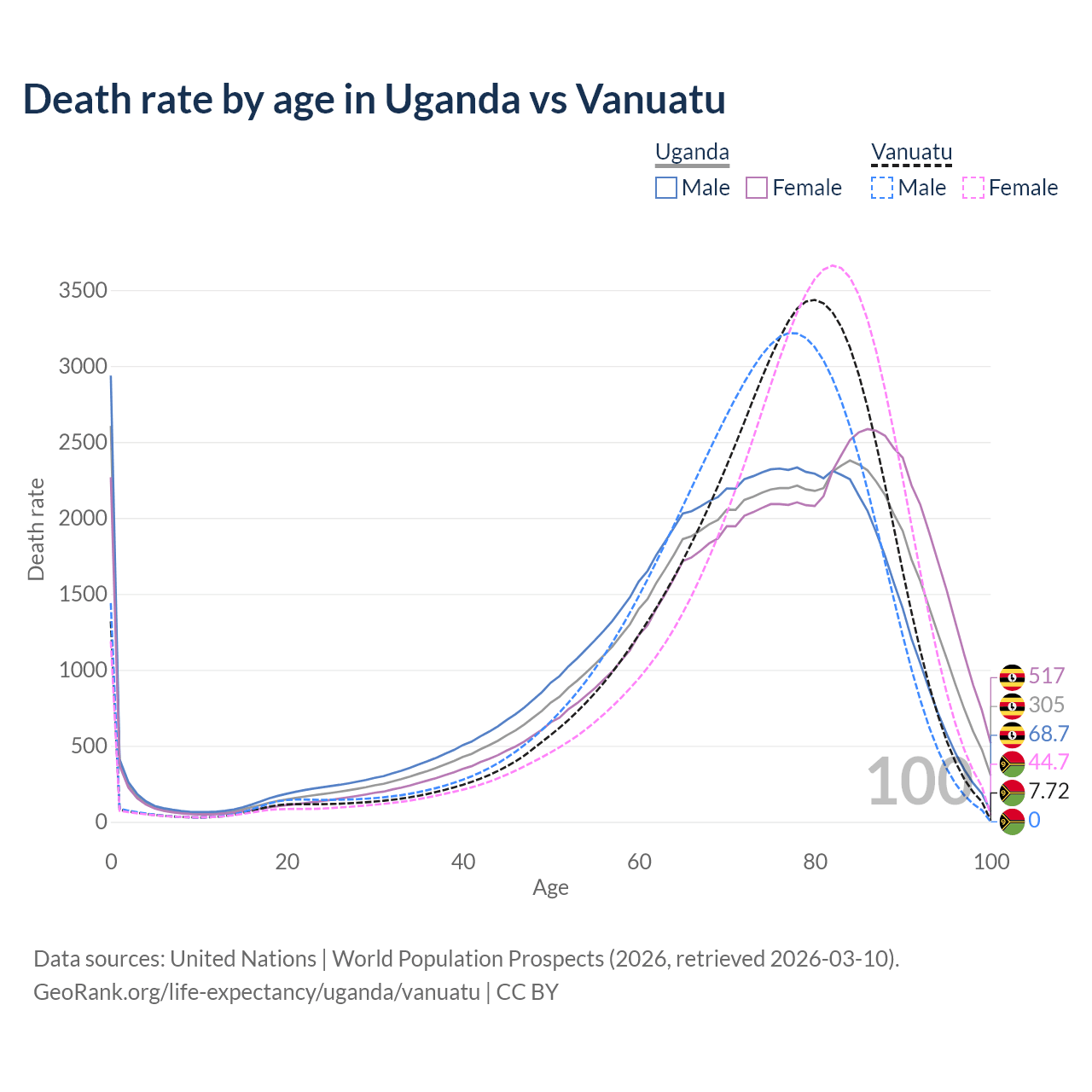 In Uganda, the most common age of death is 0, compared to 80 in Vanuatu. The median age of death is 73.3 in Uganda and 75.9 in Vanuatu, meaning only half of each cohort is expected to live past that age.
