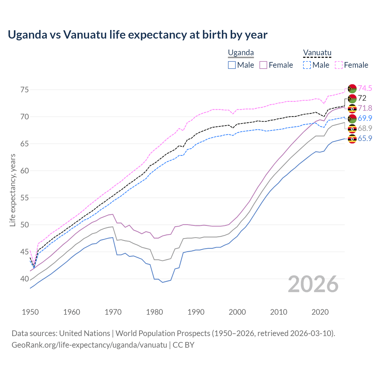 The average life expectancy at birth is 68.9 years in Uganda vs 72 in Vanuatu. Uganda is ranked 146/197 by life expectancy, and Vanuatu is 125/197. In Uganda, the life expectancy is 65.9 years for males and 71.8 years for females. In Vanuatu, it's 69.9 years for males and 74.5 years for females.