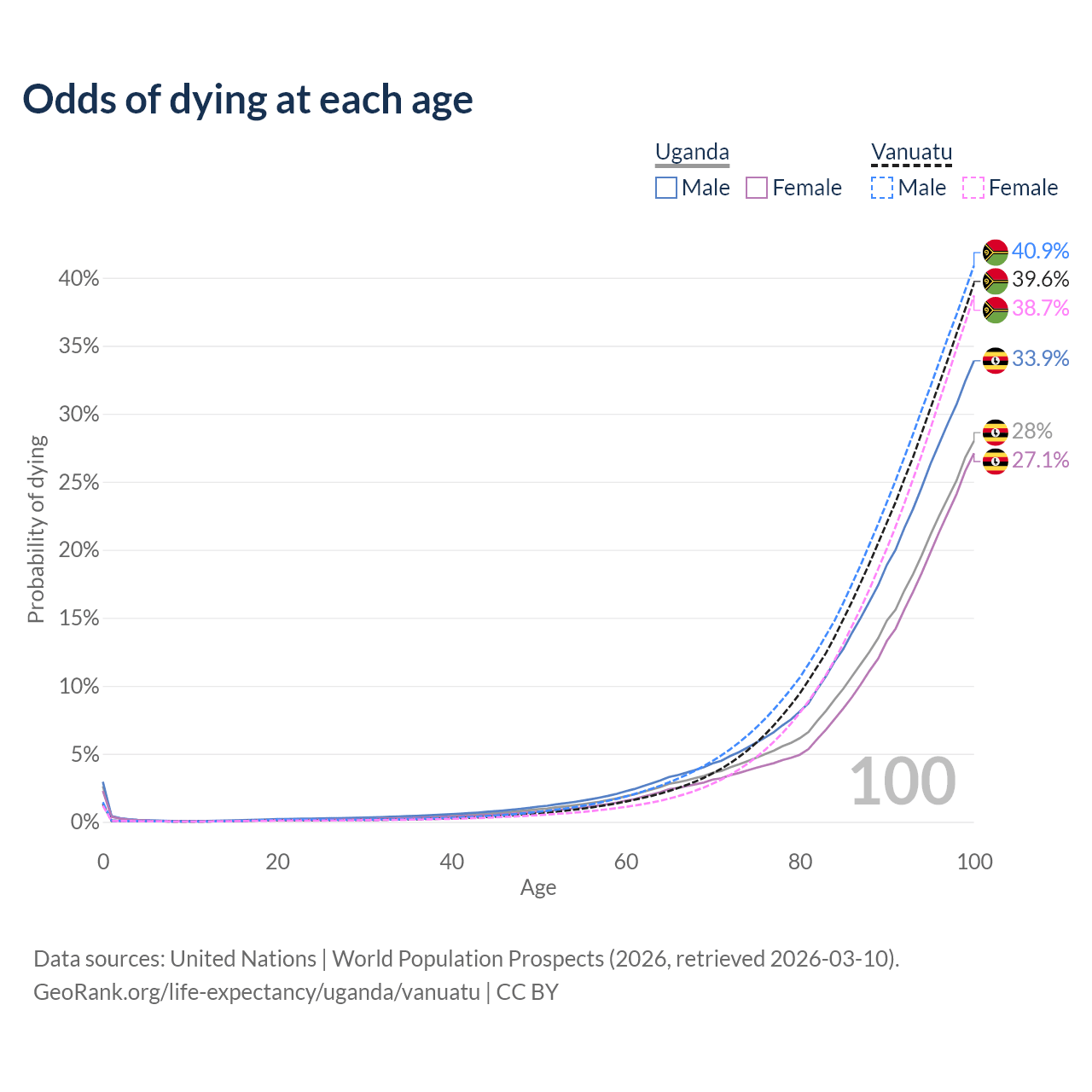 This life expectancy calculator shows the odds of living to 100, 95, 90, and below based on current age for both males and females in Uganda and Vanuatu, along with mean and median age of death. The calculations are based on the 2026 life tables (actuarial tables) from the UN World Population Prospects.
