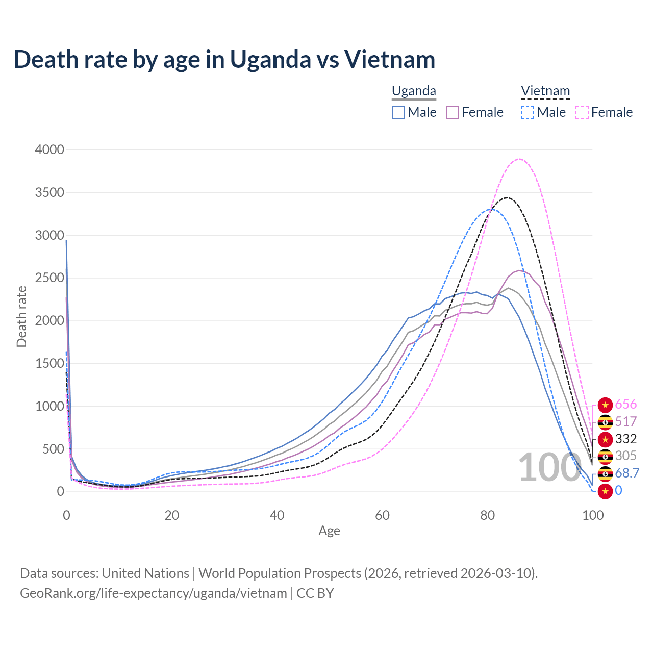 In Uganda, the most common age of death is 0, compared to 84 in Vietnam. The median age of death is 73.3 in Uganda and 79.9 in Vietnam, meaning only half of each cohort is expected to live past that age.