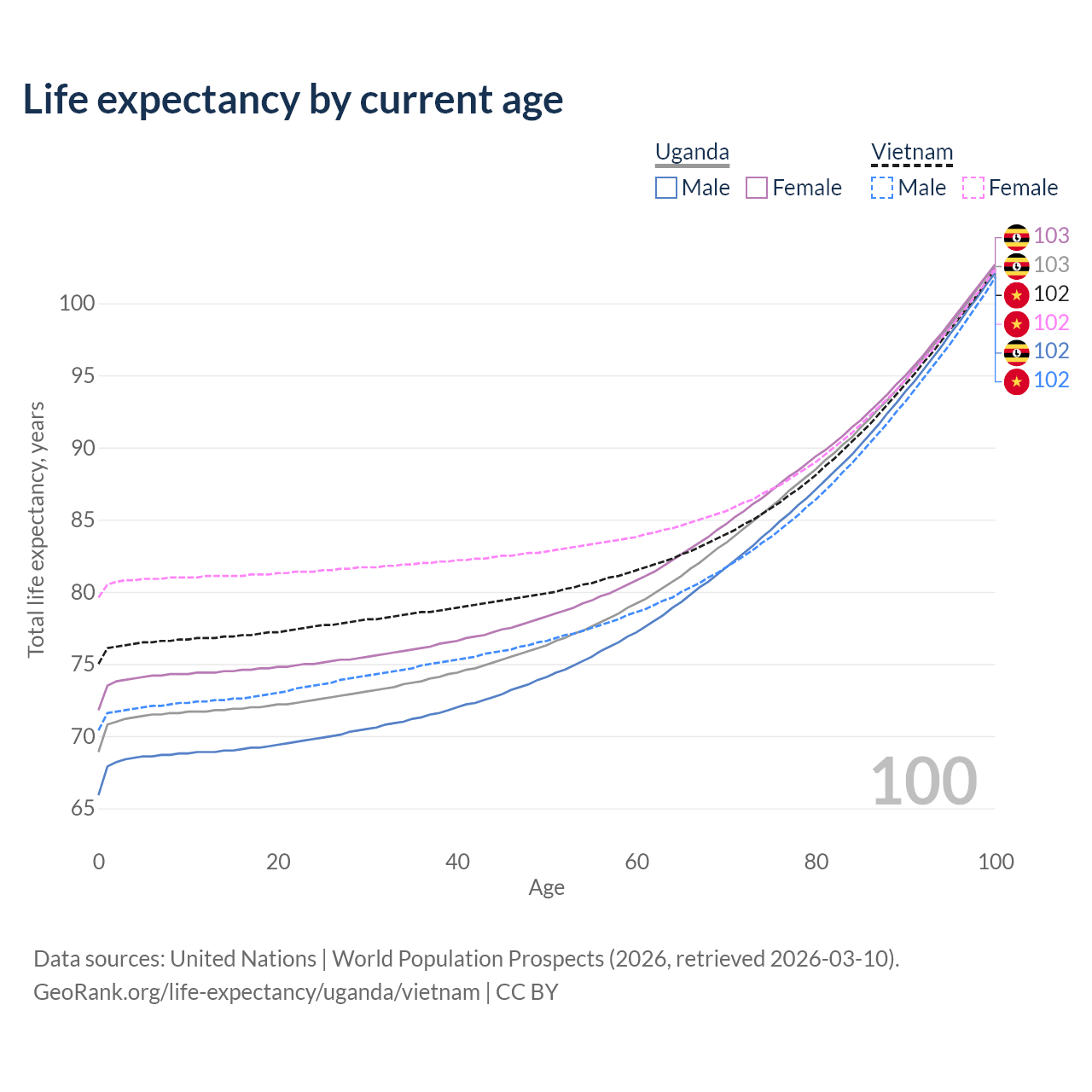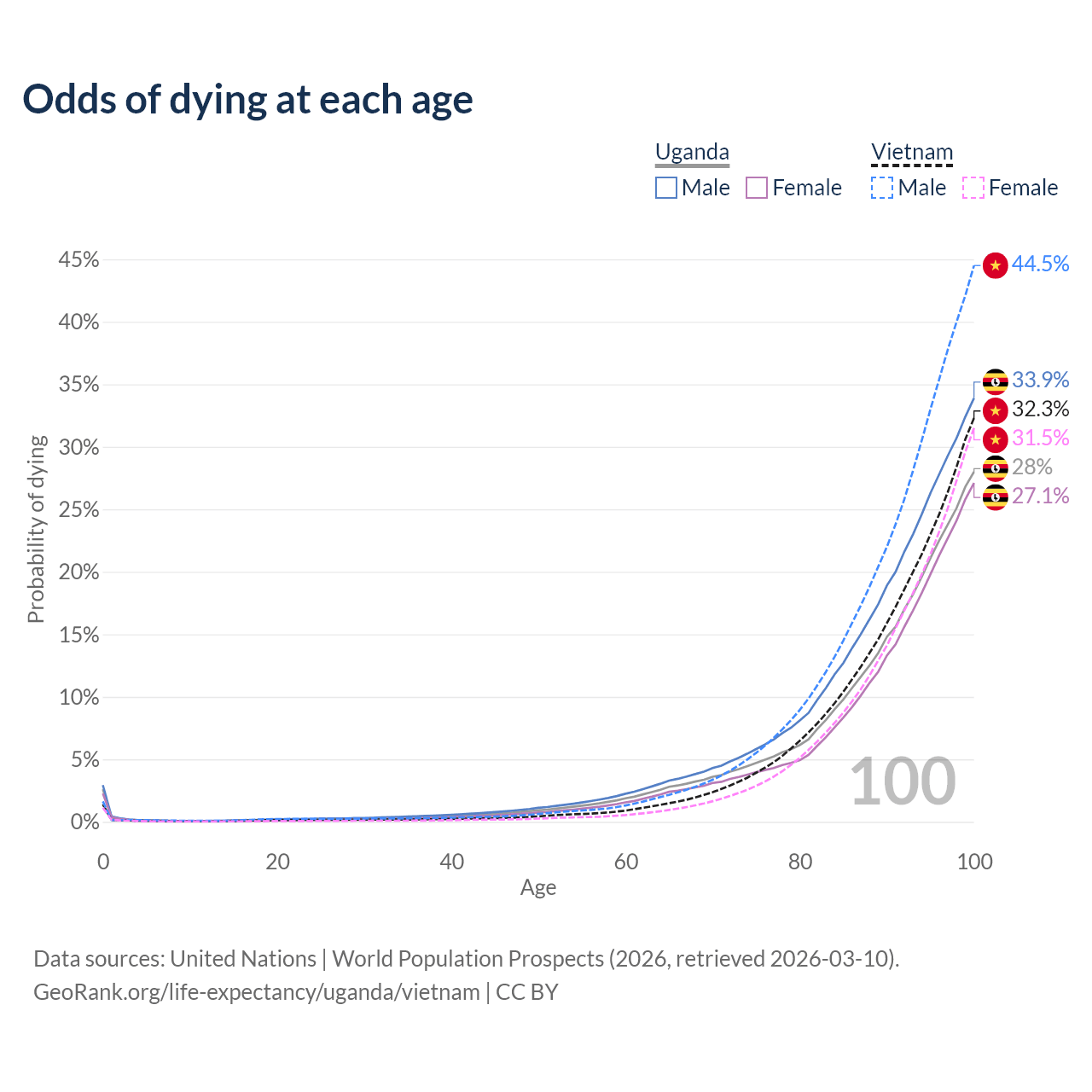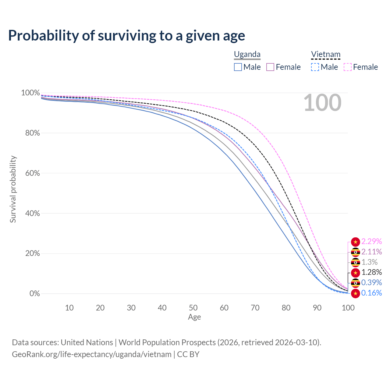 This life expectancy calculator shows the odds of living to 100, 95, 90, and below based on current age for both males and females in Uganda and Vietnam, along with mean and median age of death. The calculations are based on the 2026 life tables (actuarial tables) from the UN World Population Prospects.