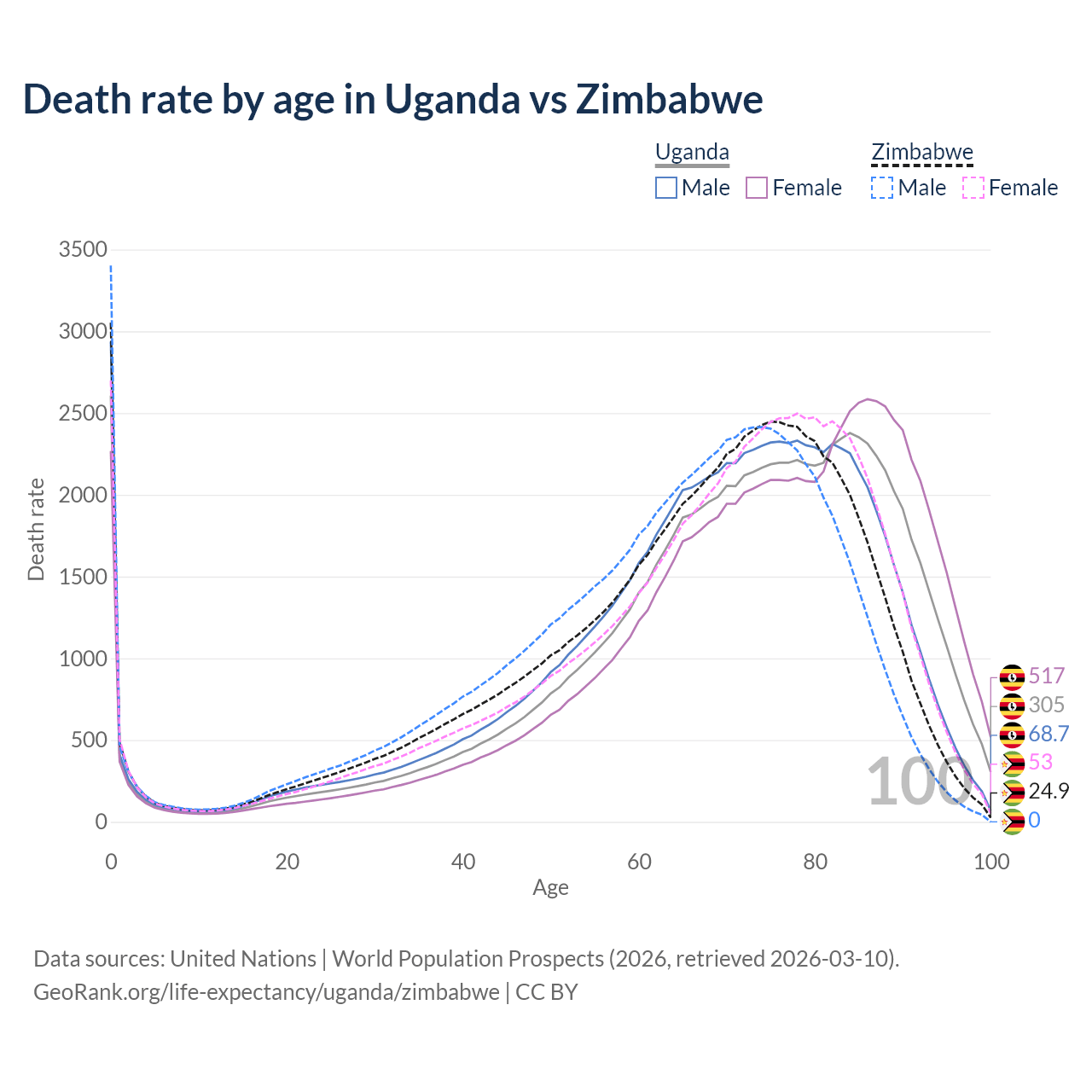 The average life expectancy at birth is 68.9 years in Uganda vs 63.6 in Zimbabwe. Uganda is ranked 146/197 by life expectancy, and Zimbabwe is 180/197. In Uganda, the life expectancy is 65.9 years for males and 71.8 years for females. In Zimbabwe, it's 61 years for males and 65.9 years for females.