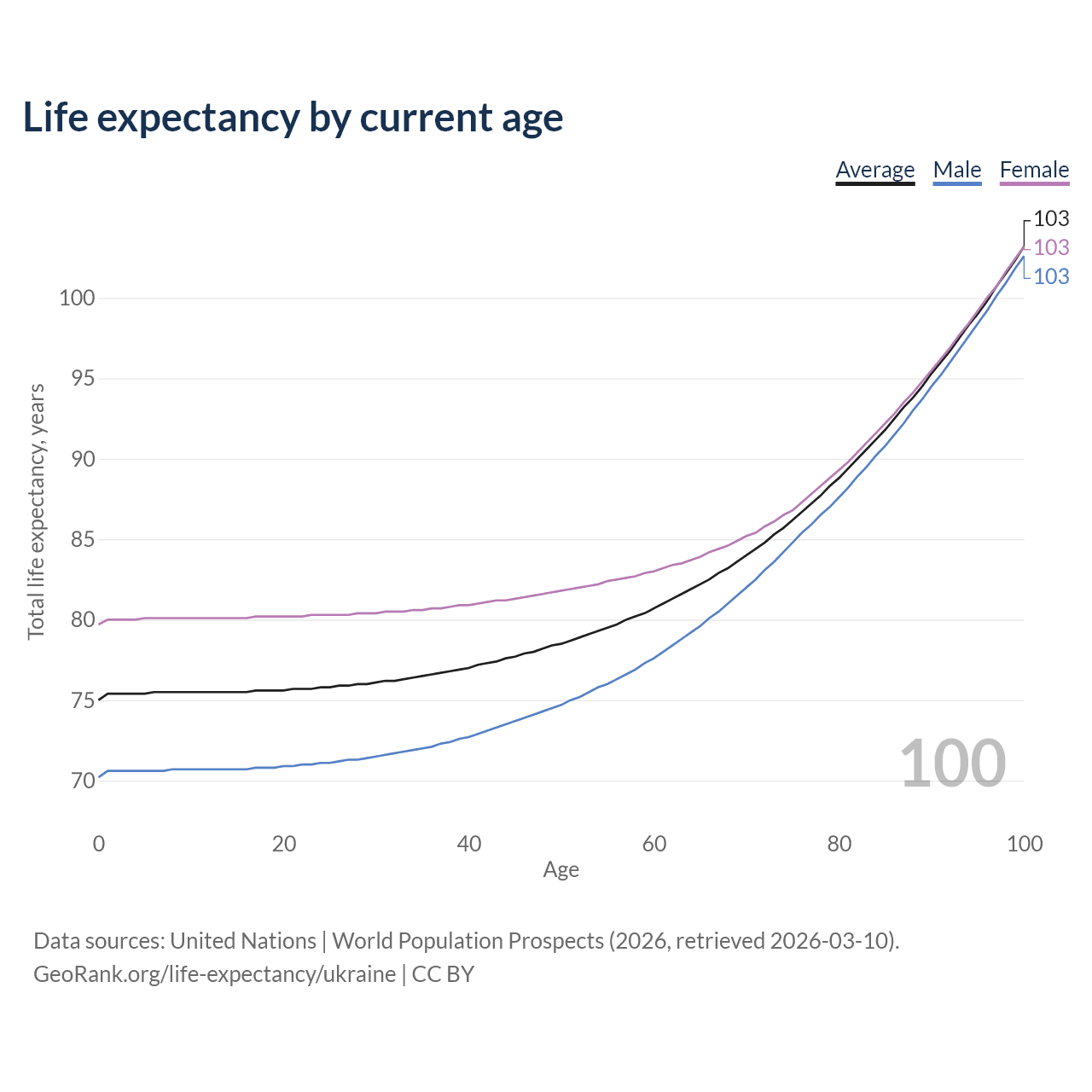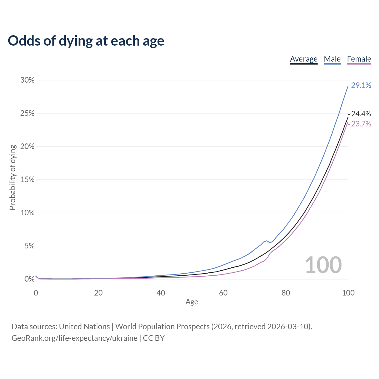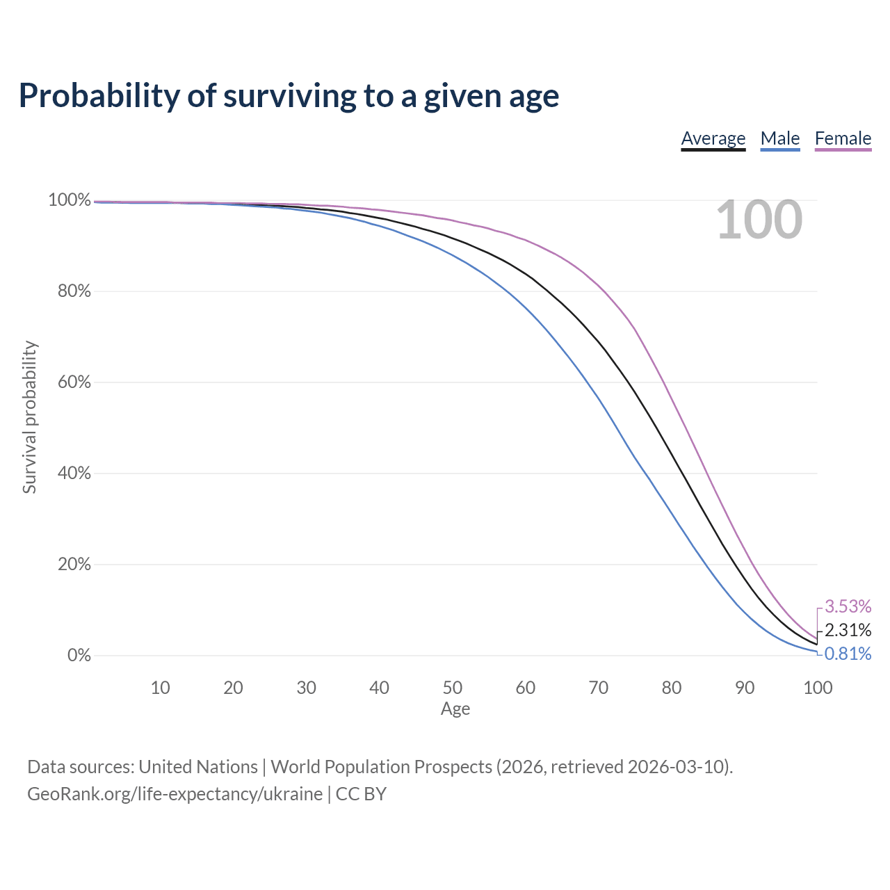 This life expectancy calculator shows the odds of living to 100, 95, 90, and below based on current age for both males and females in Ukraine, along with mean and median age of death. The calculations are based on the 2026 life tables (actuarial tables) from the UN World Population Prospects.