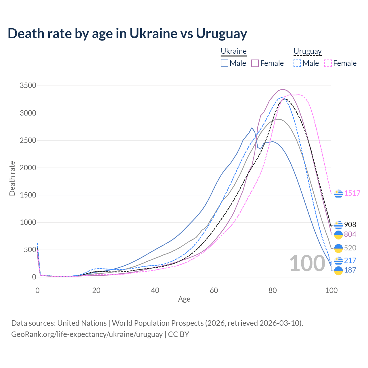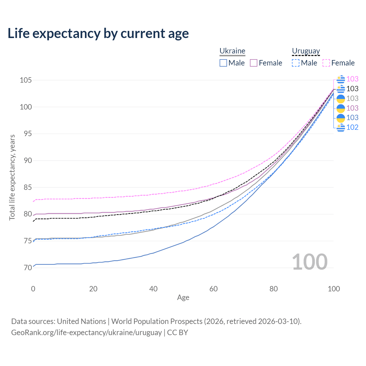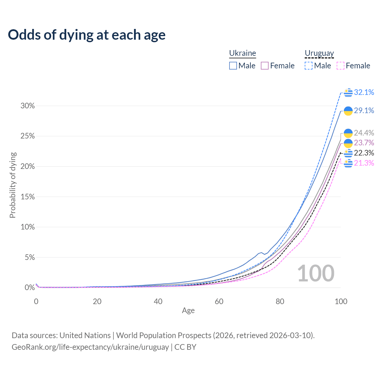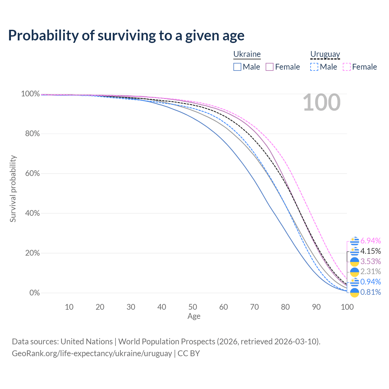 This life expectancy calculator shows the odds of living to 100, 95, 90, and below based on current age for both males and females in Ukraine and Uruguay, along with mean and median age of death. The calculations are based on the 2026 life tables (actuarial tables) from the UN World Population Prospects.