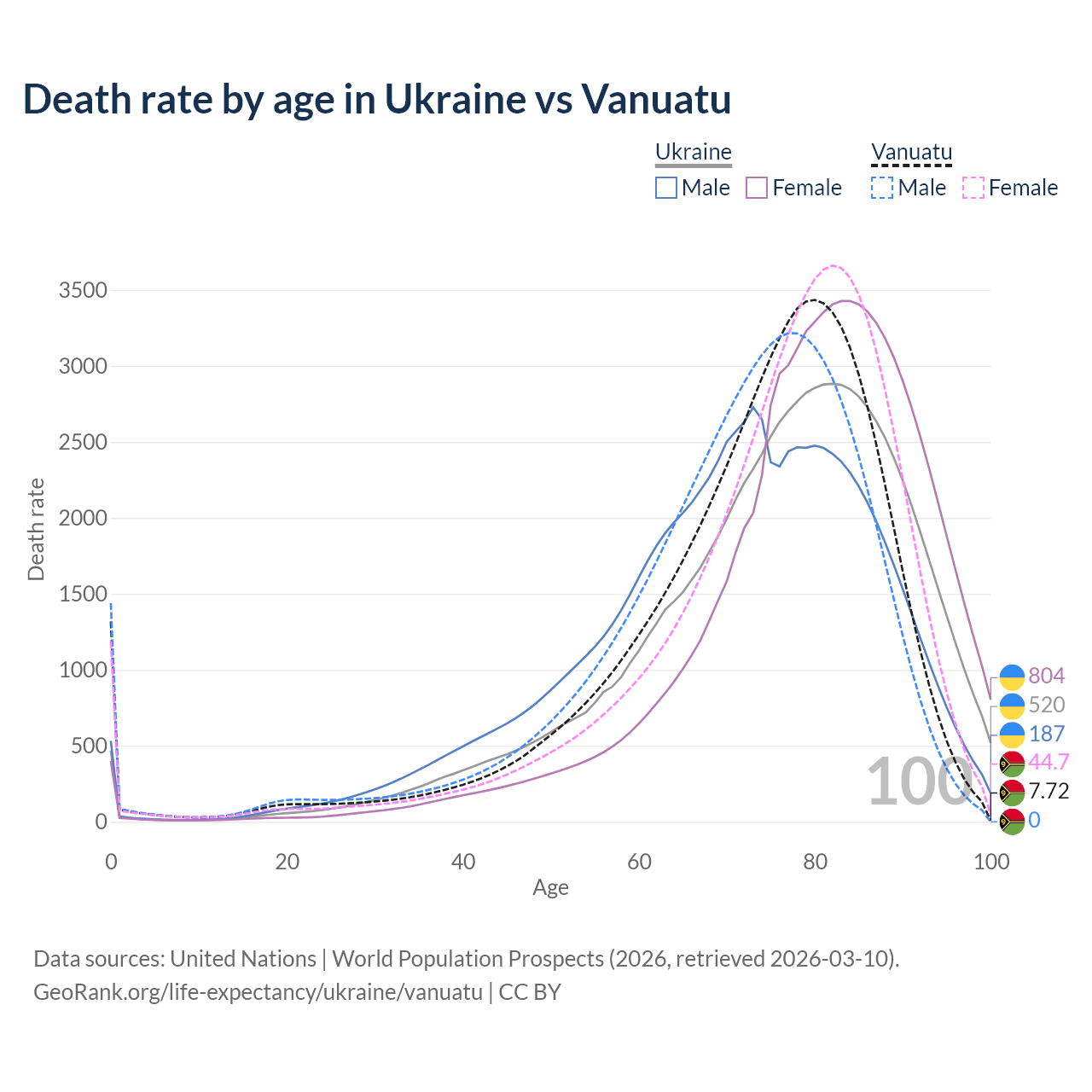 In Ukraine, the most common age of death is 82, compared to 80 in Vanuatu. The median age of death is 78 in Ukraine and 75.9 in Vanuatu, meaning only half of each cohort is expected to live past that age.