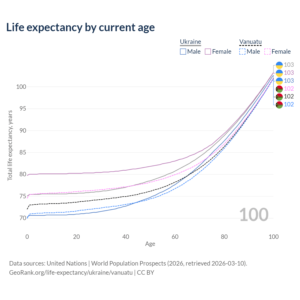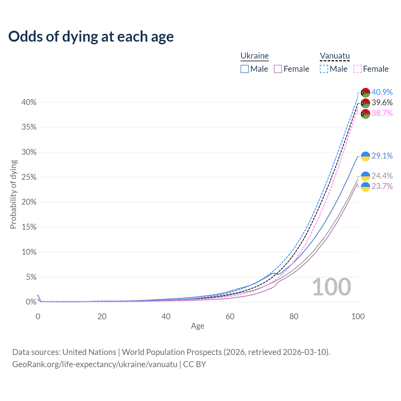 This life expectancy calculator shows the odds of living to 100, 95, 90, and below based on current age for both males and females in Ukraine and Vanuatu, along with mean and median age of death. The calculations are based on the 2026 life tables (actuarial tables) from the UN World Population Prospects.