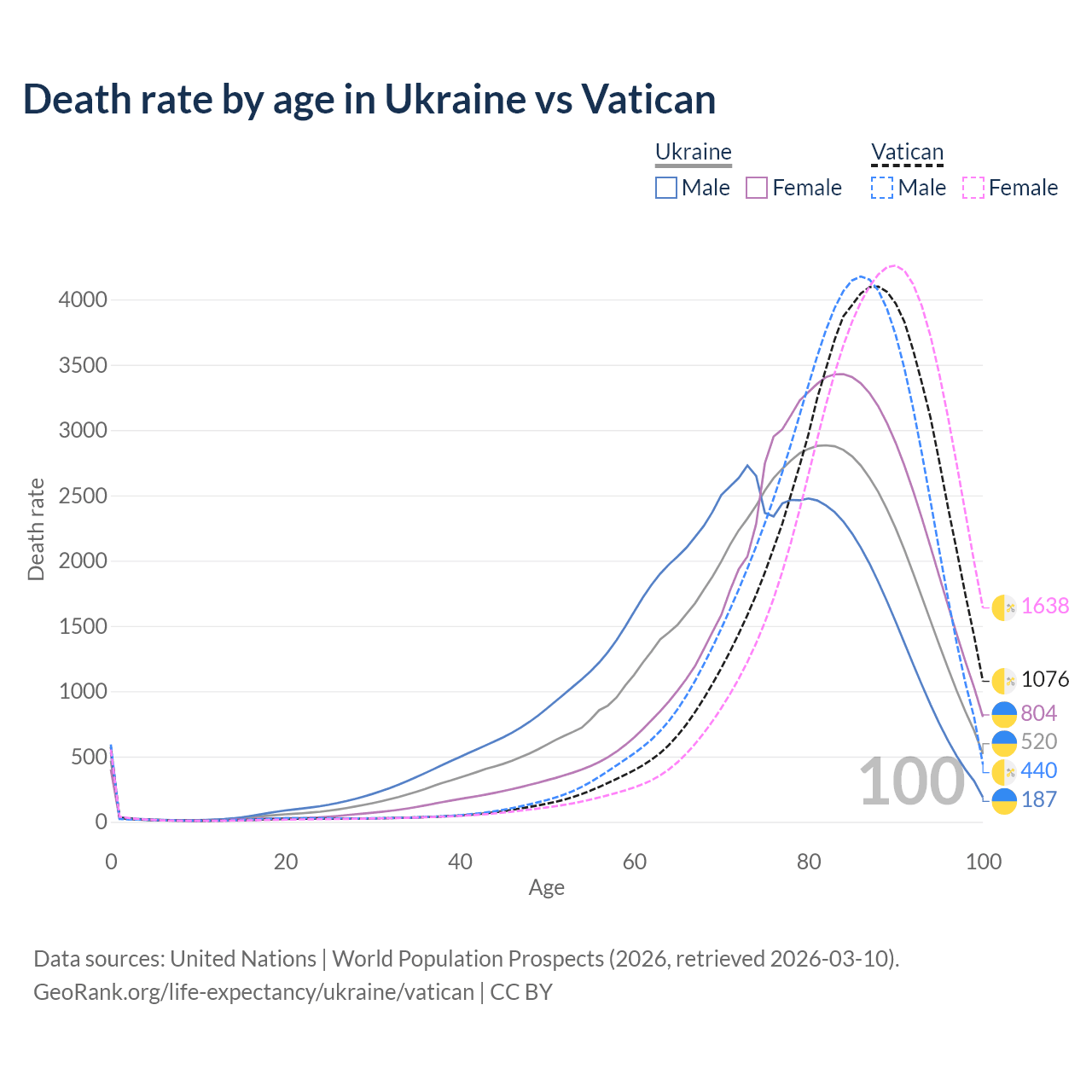 This life expectancy calculator shows the odds of living to 100, 95, 90, and below based on current age for both males and females in Ukraine and the Vatican, along with mean and median age of death. The calculations are based on the 2026 life tables (actuarial tables) from the UN World Population Prospects.