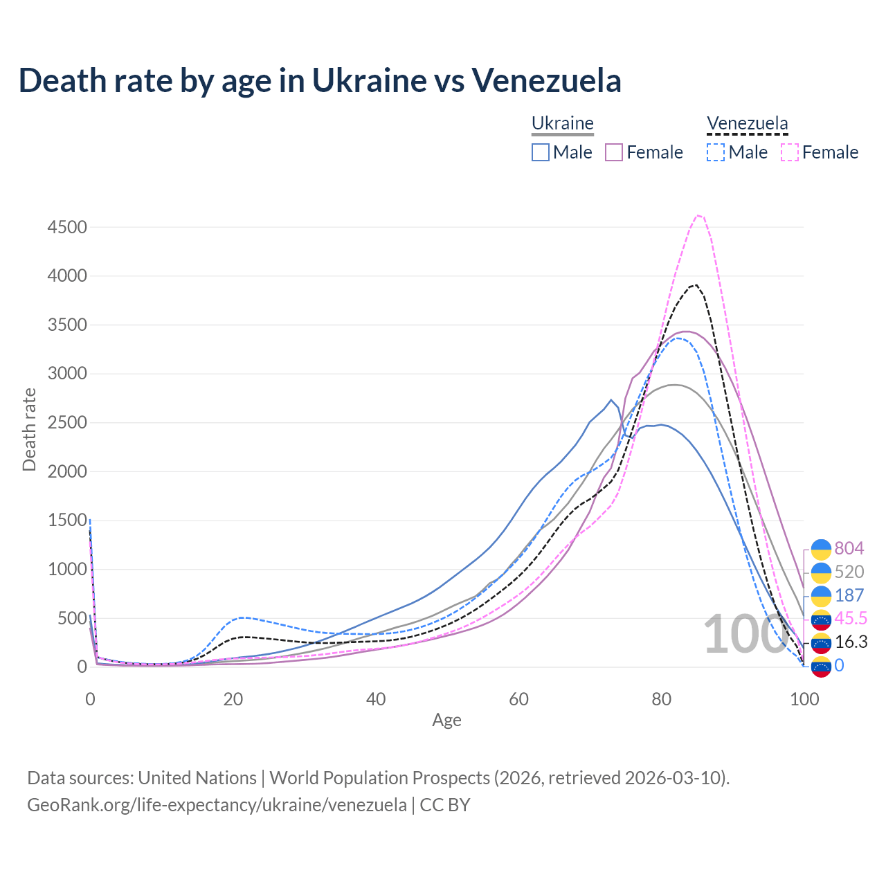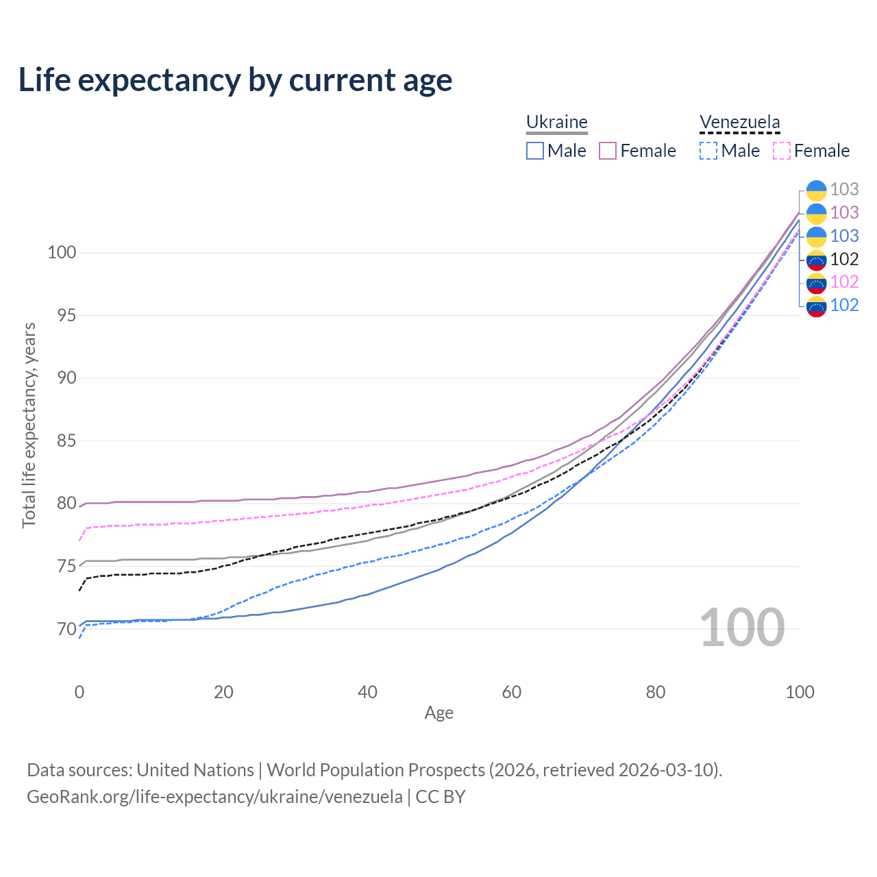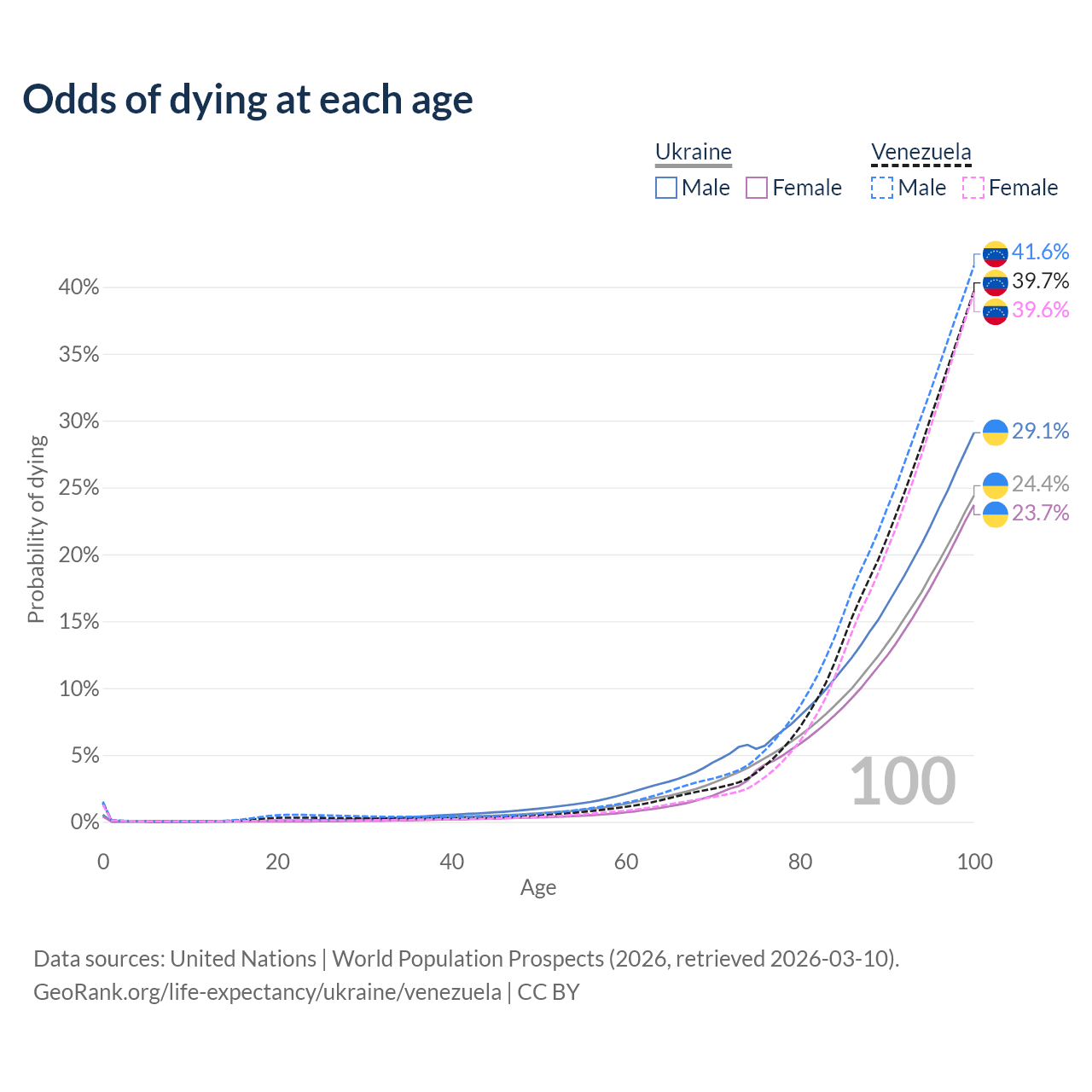 This life expectancy calculator shows the odds of living to 100, 95, 90, and below based on current age for both males and females in Ukraine and Venezuela, along with mean and median age of death. The calculations are based on the 2026 life tables (actuarial tables) from the UN World Population Prospects.