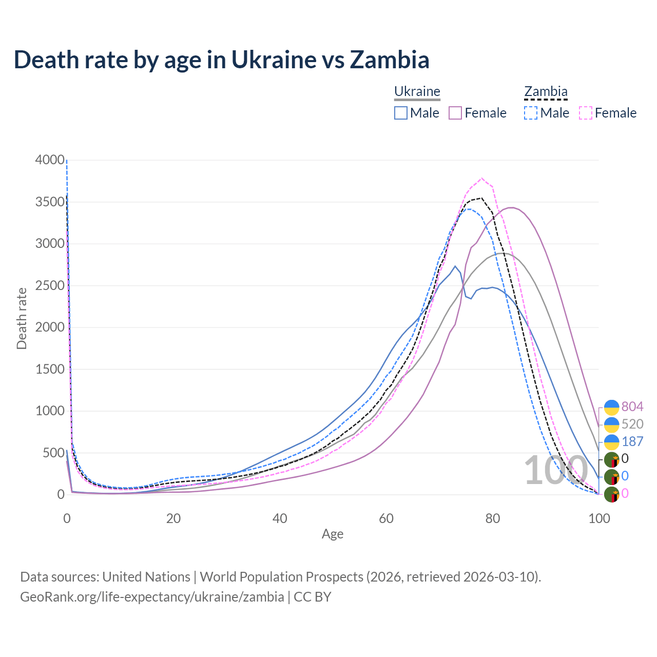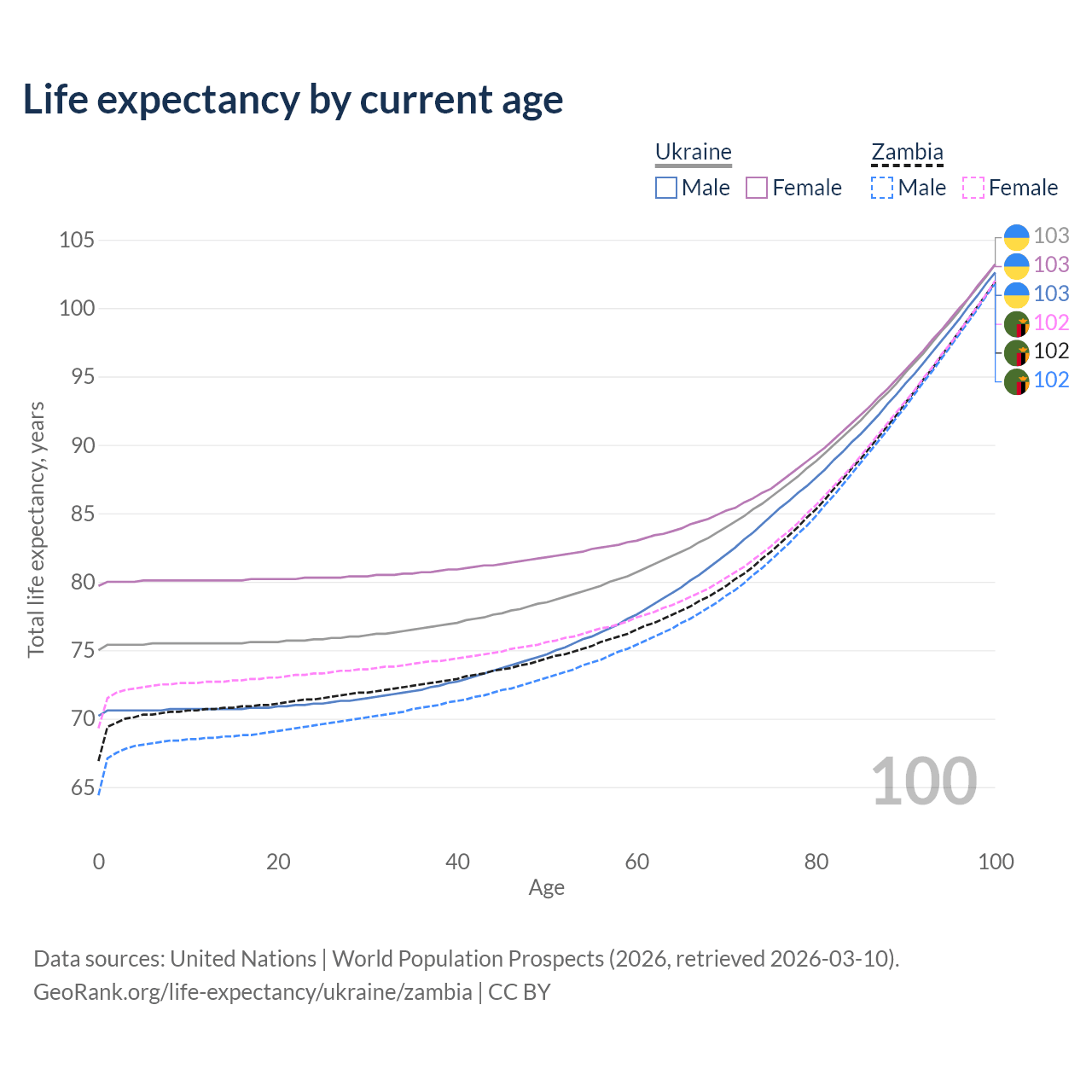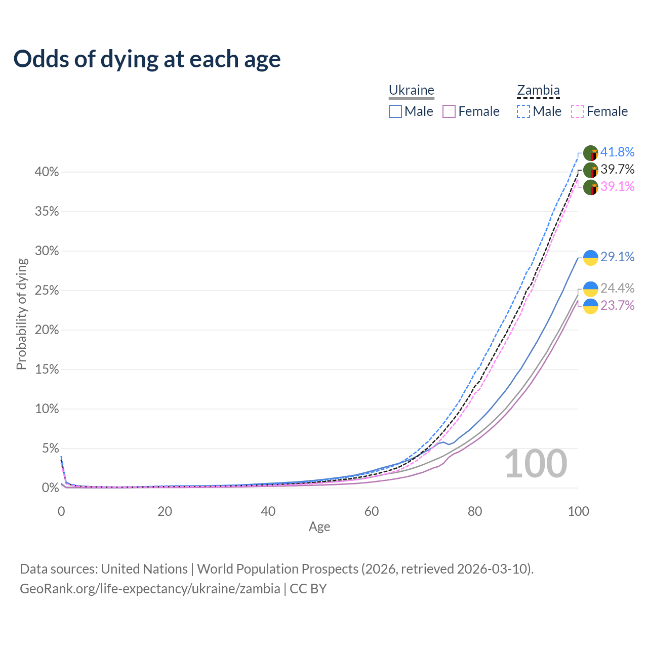 This life expectancy calculator shows the odds of living to 100, 95, 90, and below based on current age for both males and females in Ukraine and Zambia, along with mean and median age of death. The calculations are based on the 2026 life tables (actuarial tables) from the UN World Population Prospects.