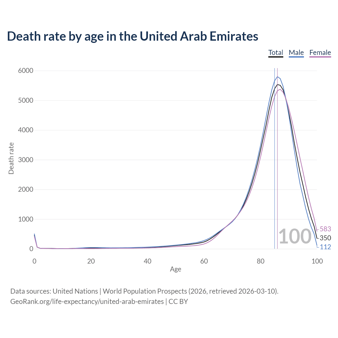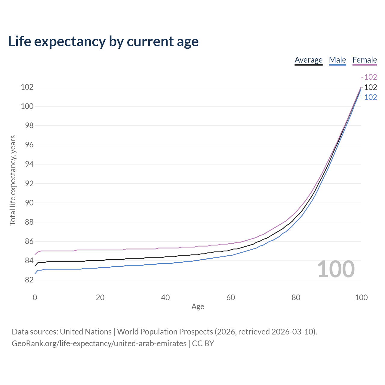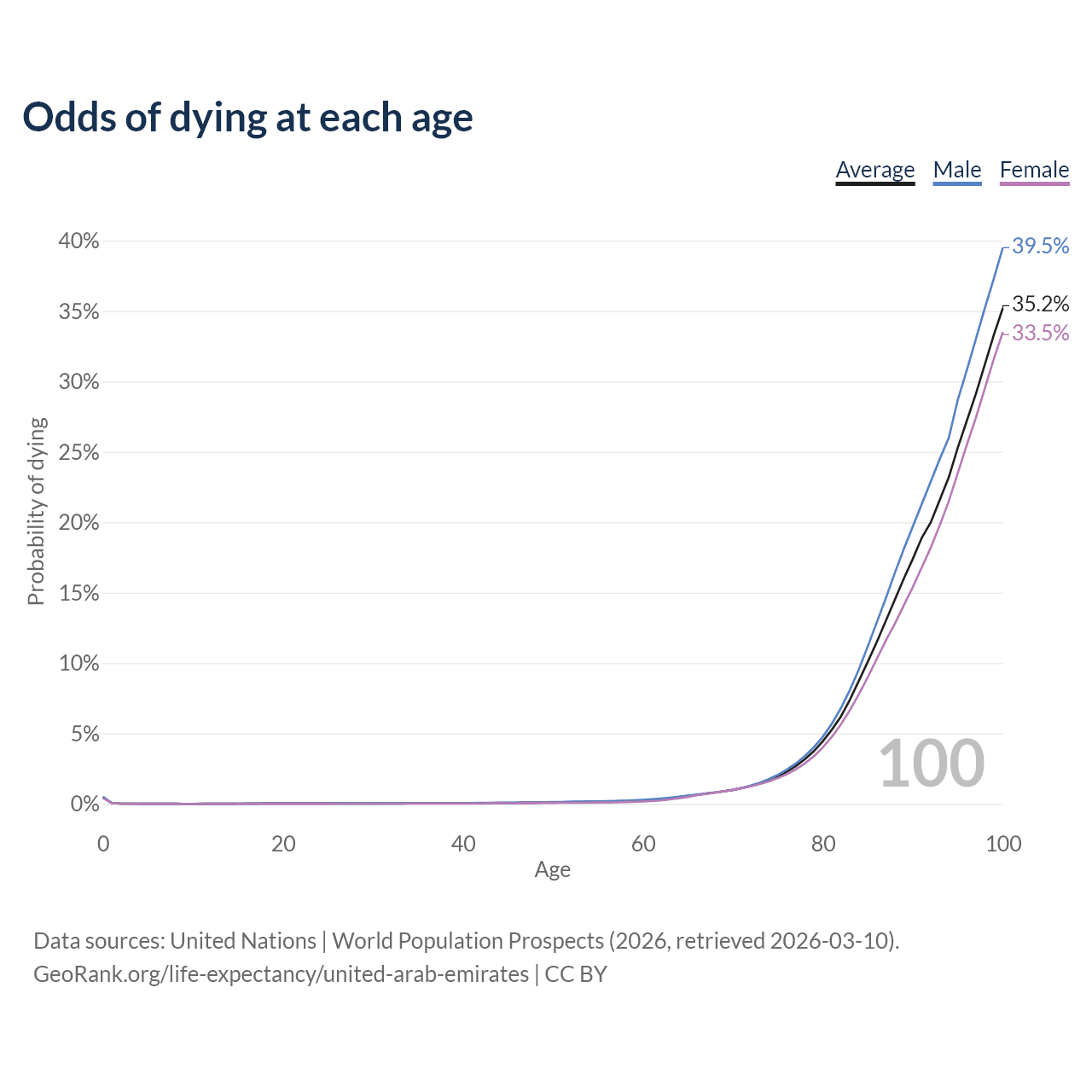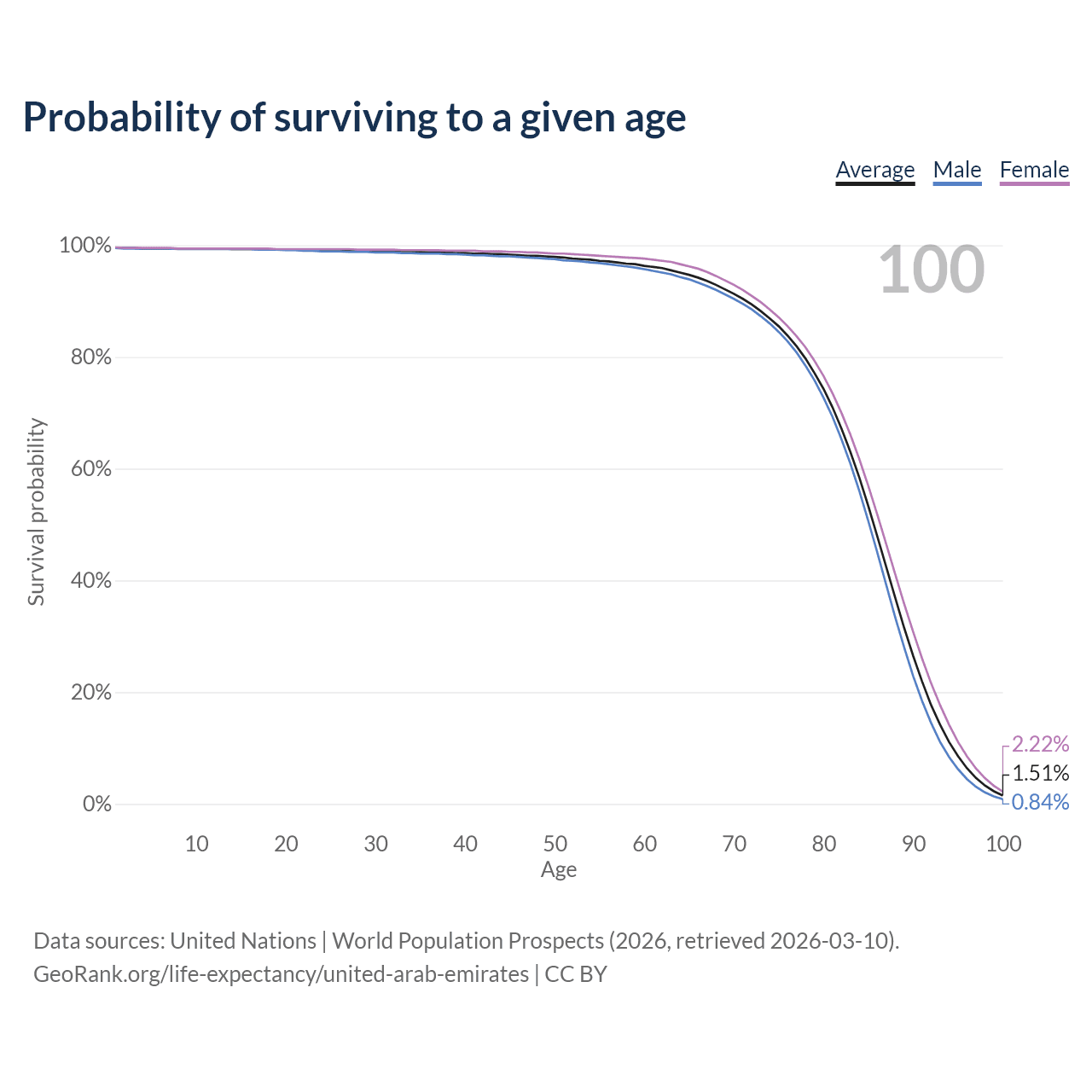 This life expectancy calculator shows the odds of living to 100, 95, 90, and below based on current age for both males and females in the United Arab Emirates, along with mean and median age of death. The calculations are based on the 2026 life tables (actuarial tables) from the UN World Population Prospects.