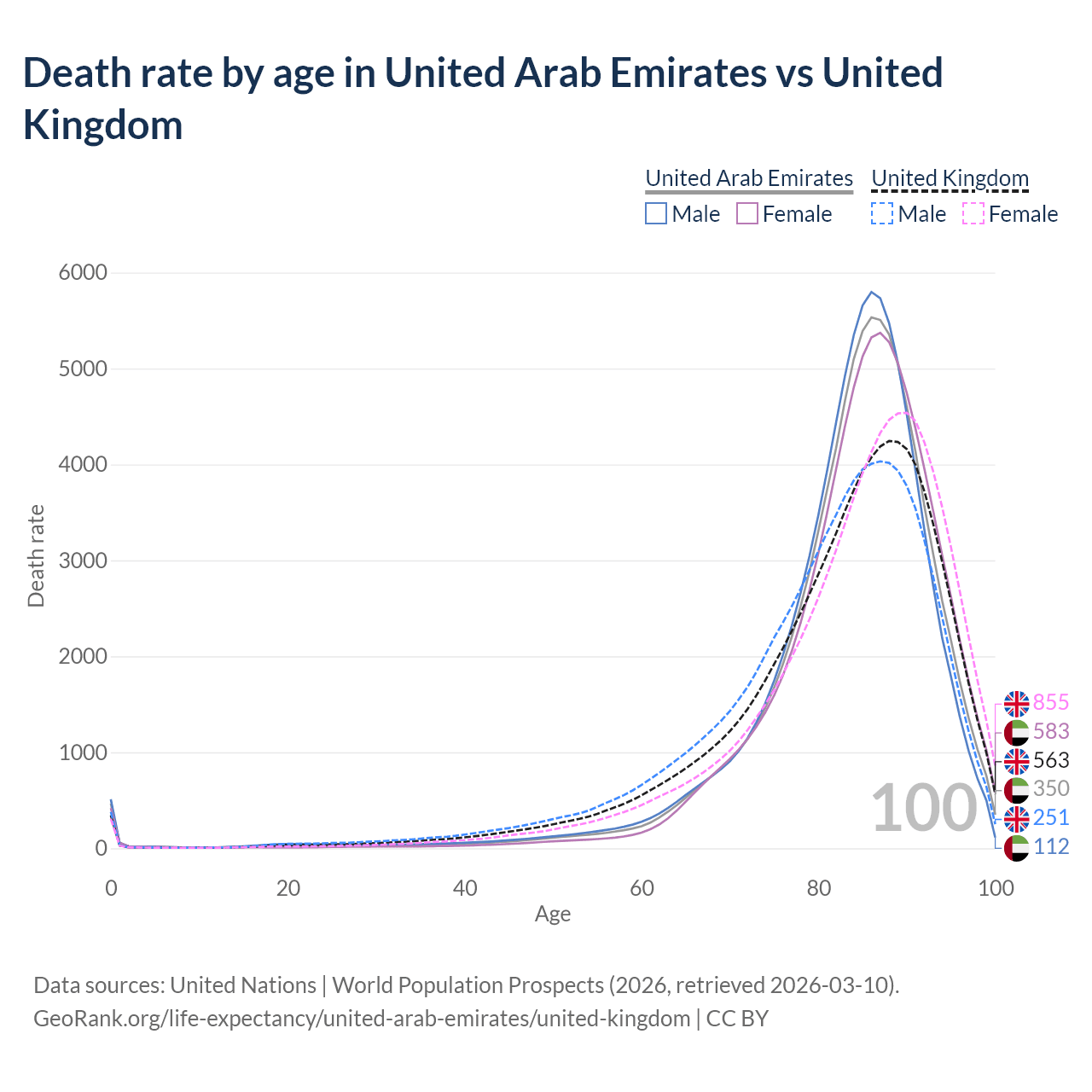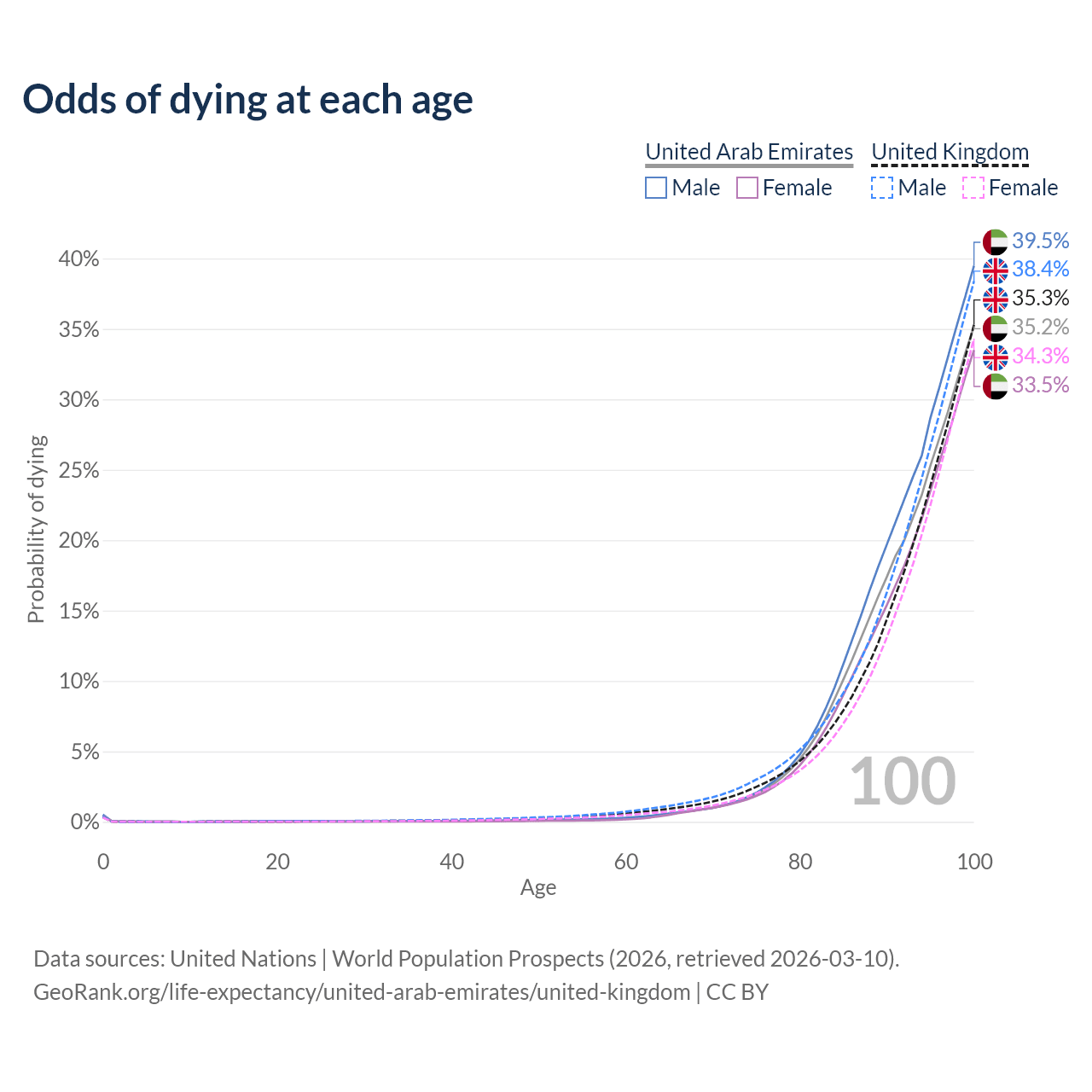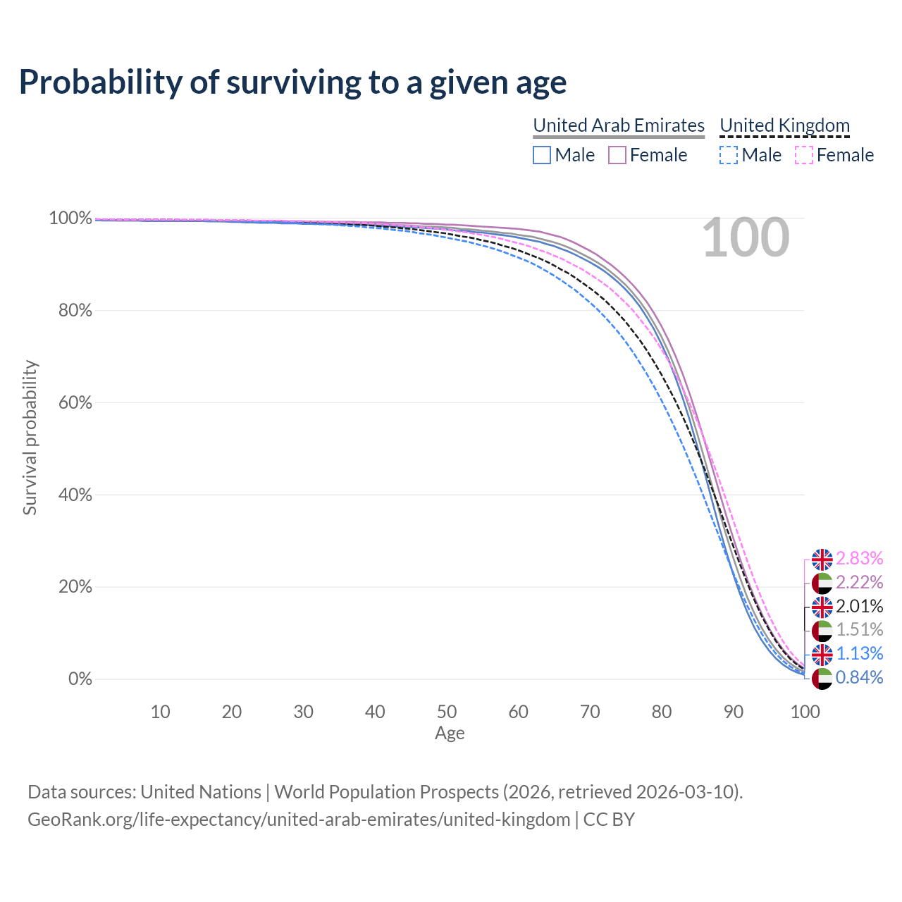 This life expectancy calculator shows the odds of living to 100, 95, 90, and below based on current age for both males and females in the United Arab Emirates and the United Kingdom, along with mean and median age of death. The calculations are based on the 2026 life tables (actuarial tables) from the UN World Population Prospects.