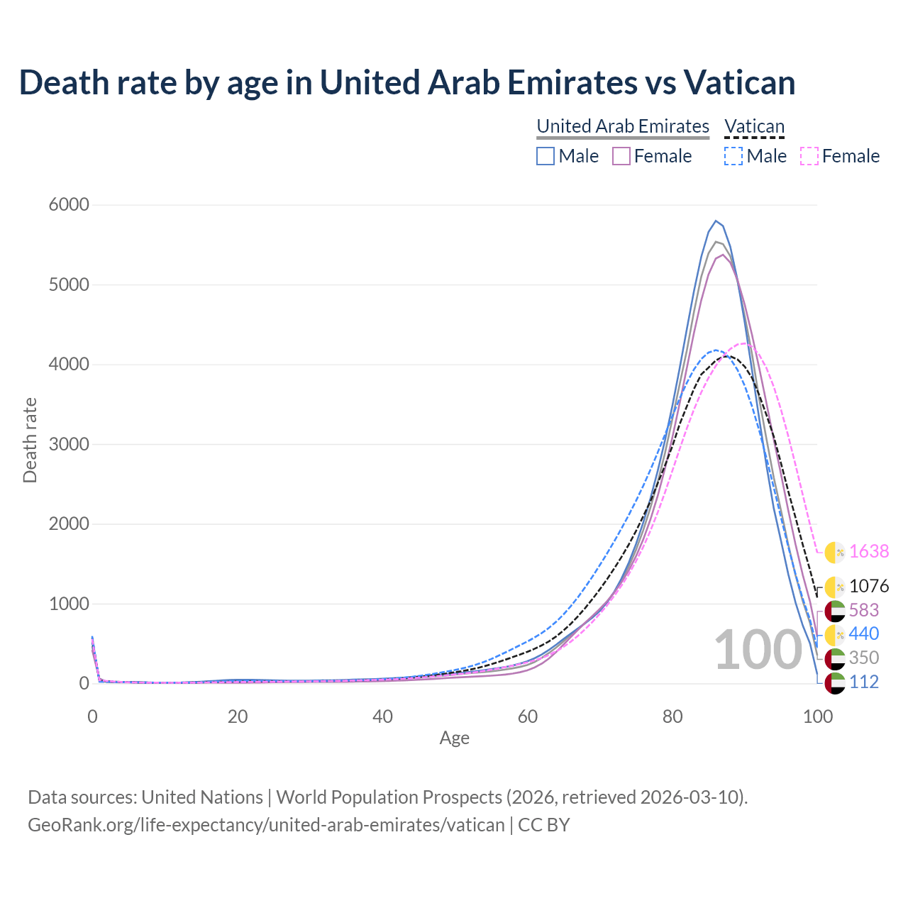 In the United Arab Emirates, the most common age of death is 86, compared to 88 in the Vatican. The median age of death is 85.6 in the United Arab Emirates and 85.7 in the Vatican, meaning only half of each cohort is expected to live past that age.