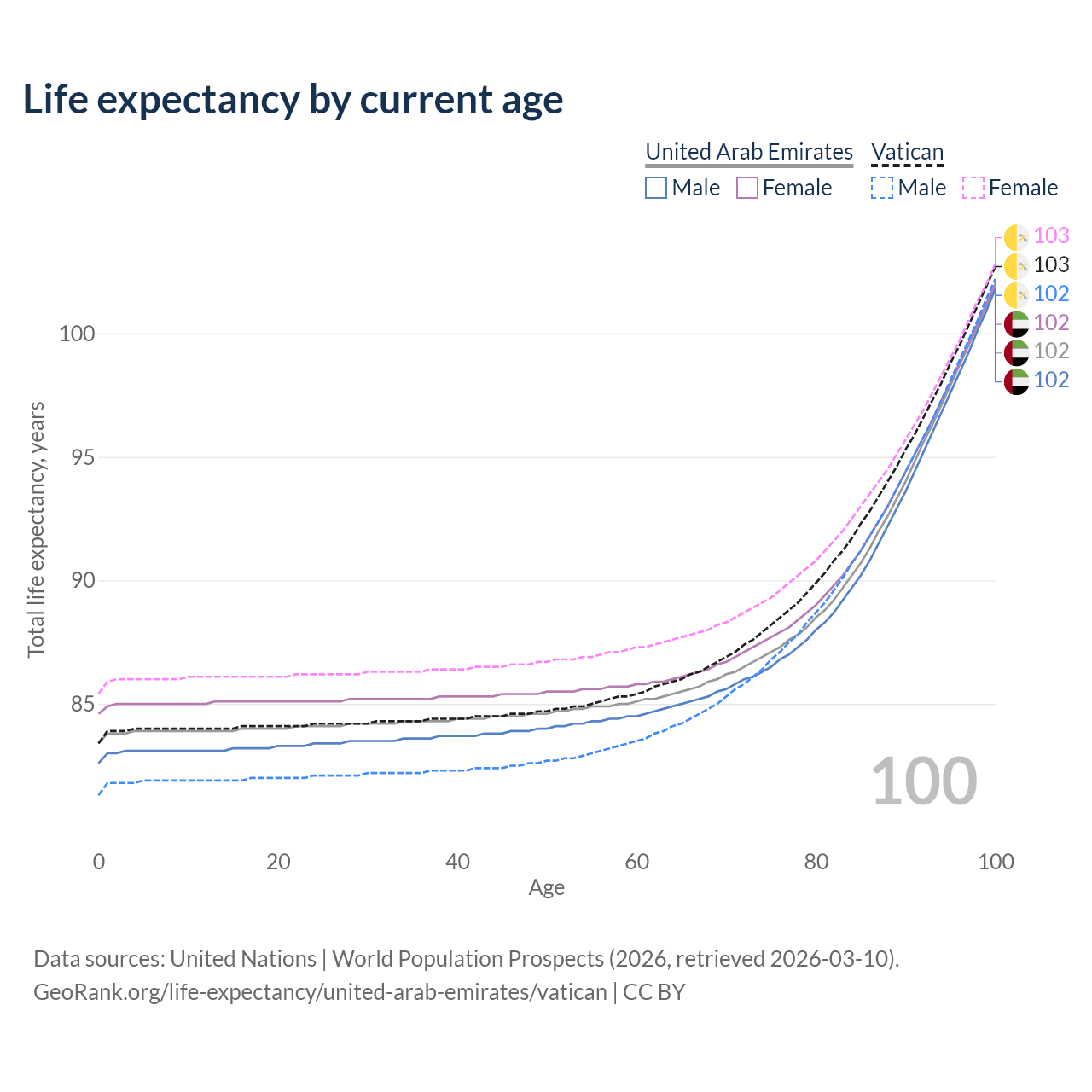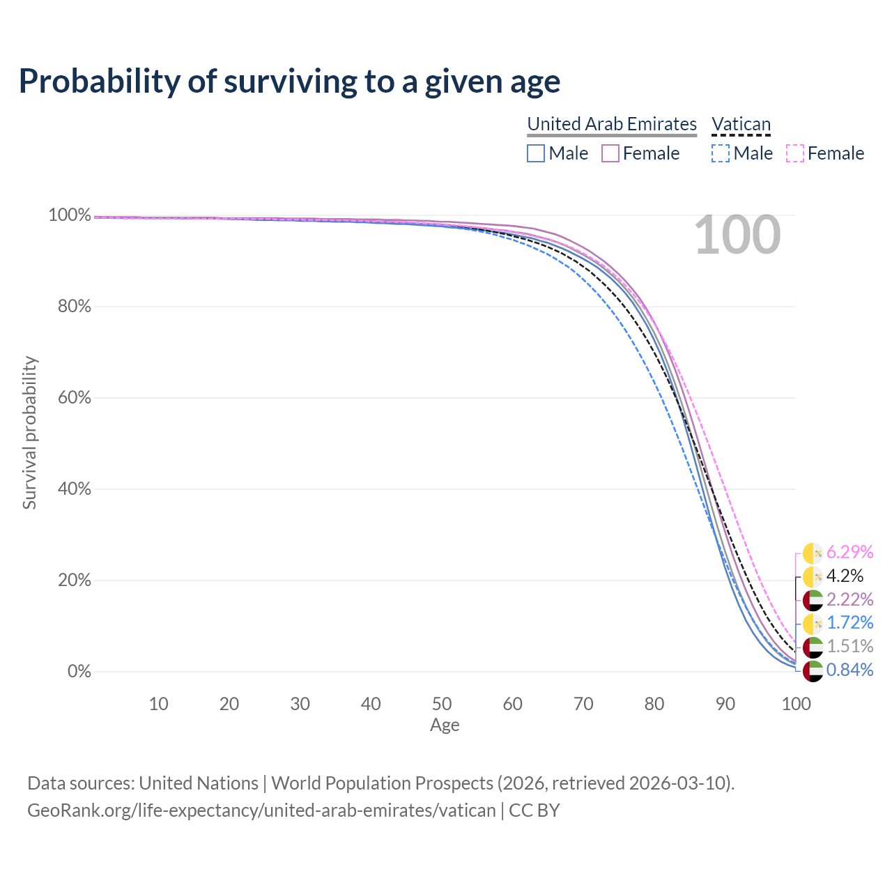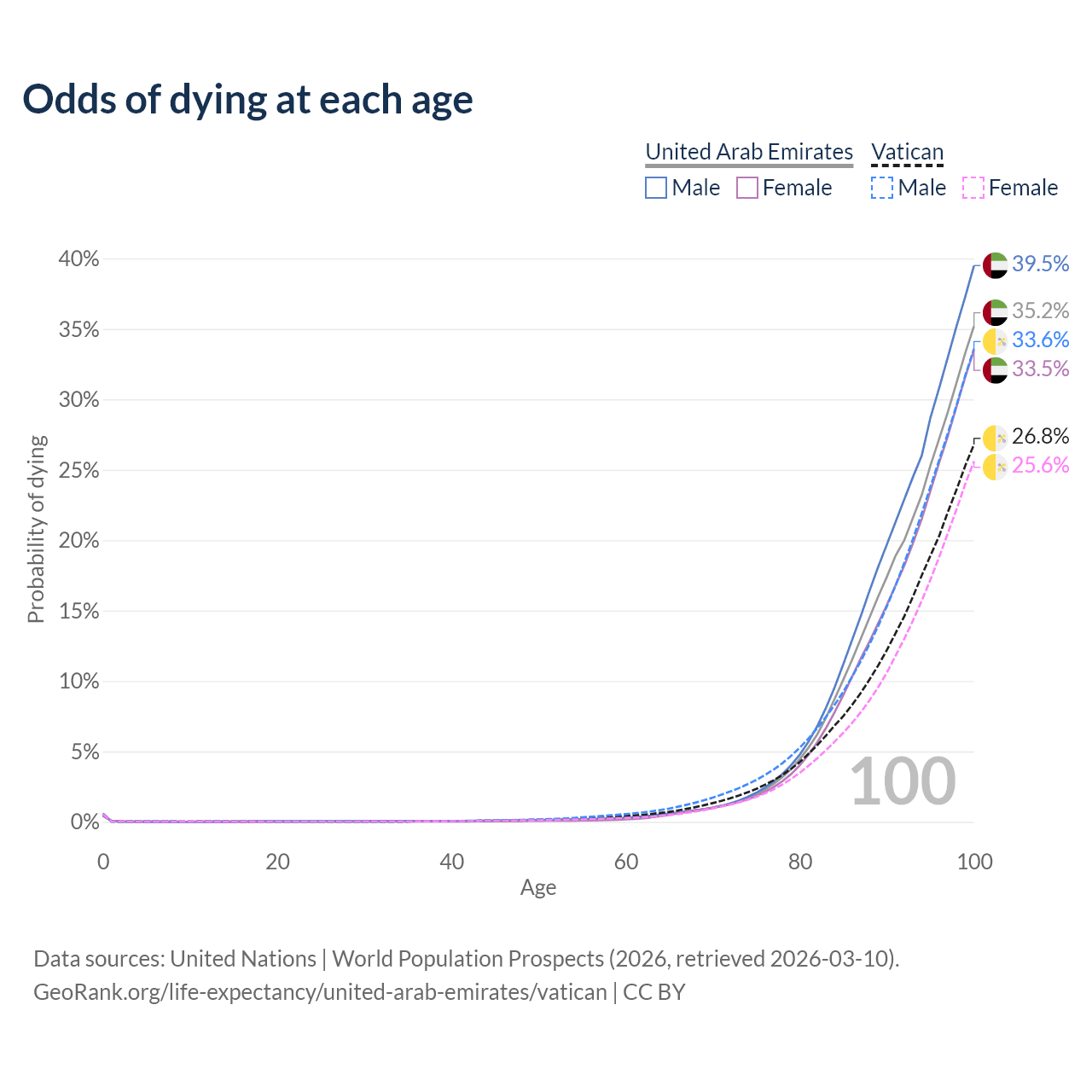 This life expectancy calculator shows the odds of living to 100, 95, 90, and below based on current age for both males and females in the United Arab Emirates and the Vatican, along with mean and median age of death. The calculations are based on the 2026 life tables (actuarial tables) from the UN World Population Prospects.