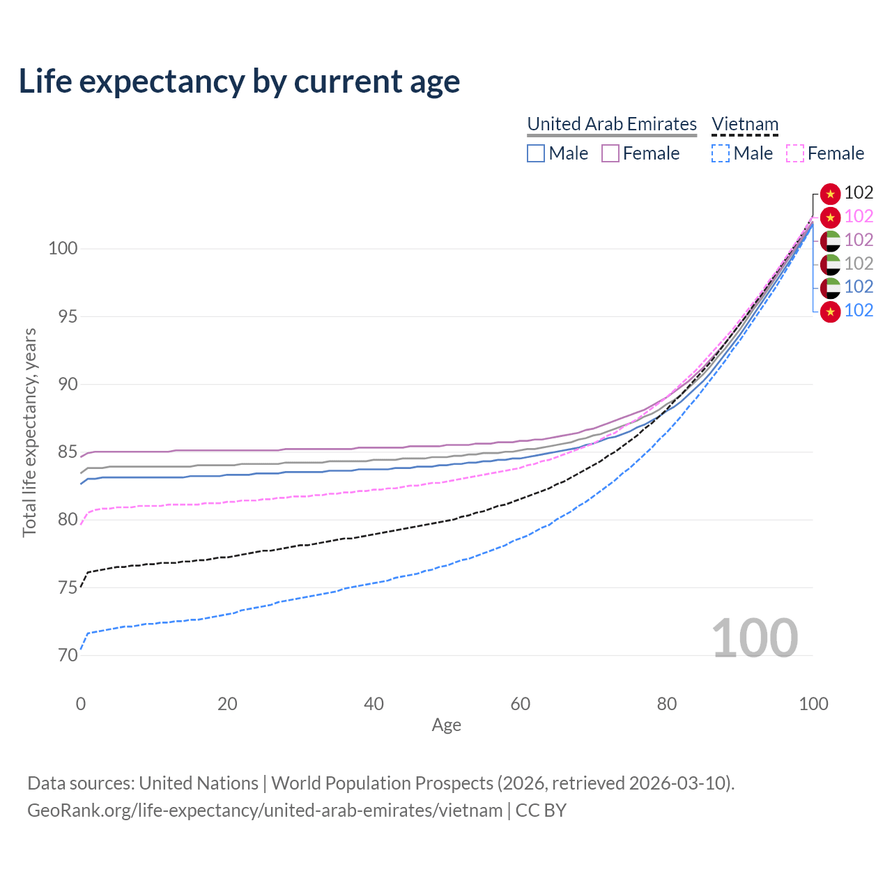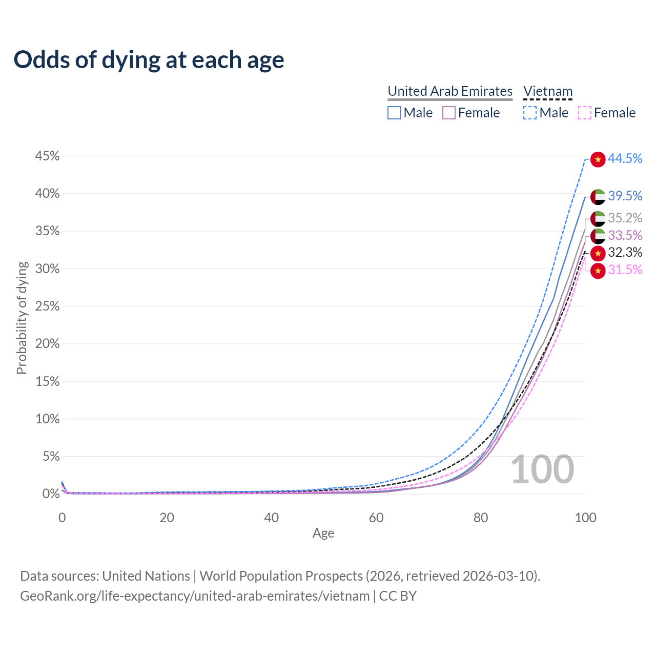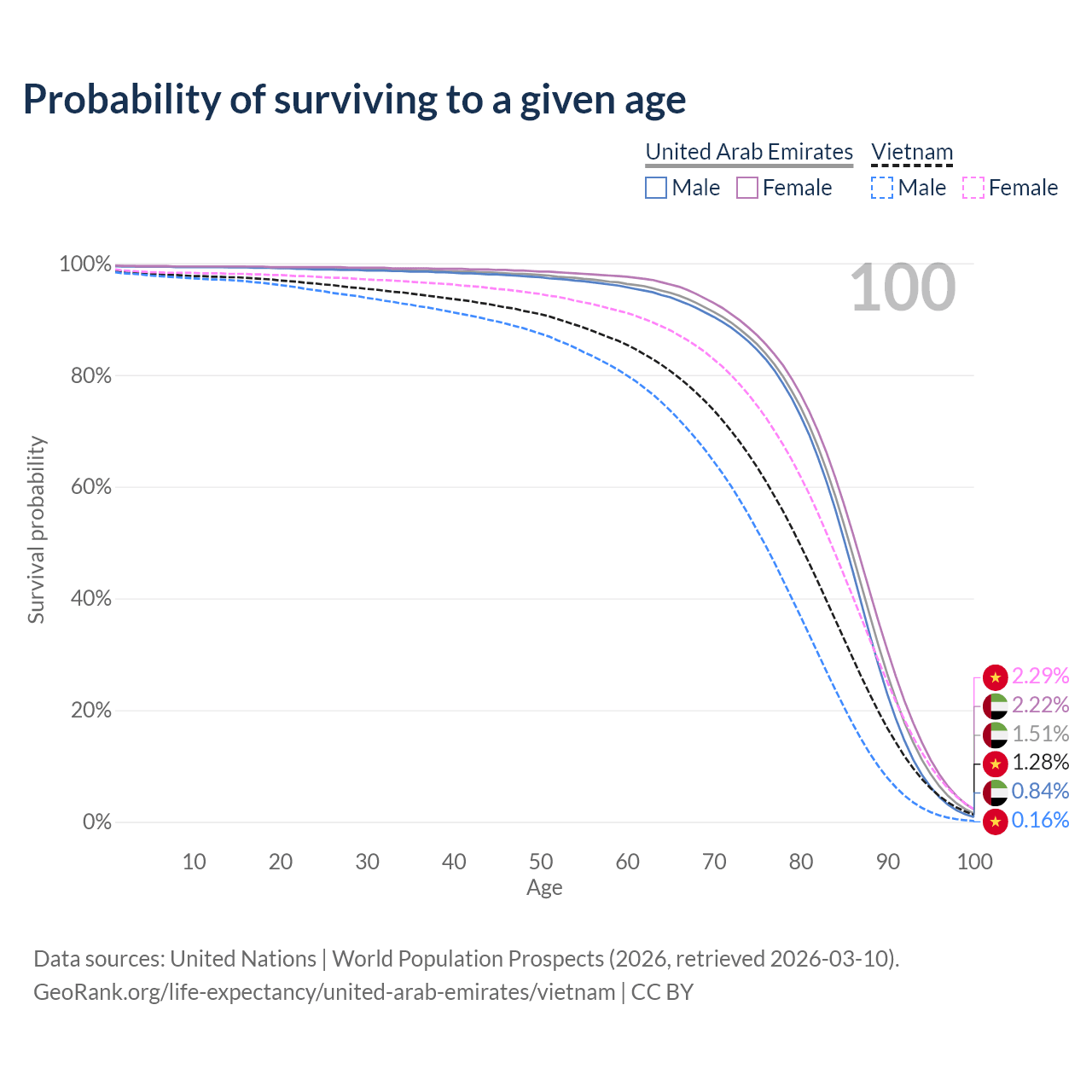 This life expectancy calculator shows the odds of living to 100, 95, 90, and below based on current age for both males and females in the United Arab Emirates and Vietnam, along with mean and median age of death. The calculations are based on the 2026 life tables (actuarial tables) from the UN World Population Prospects.