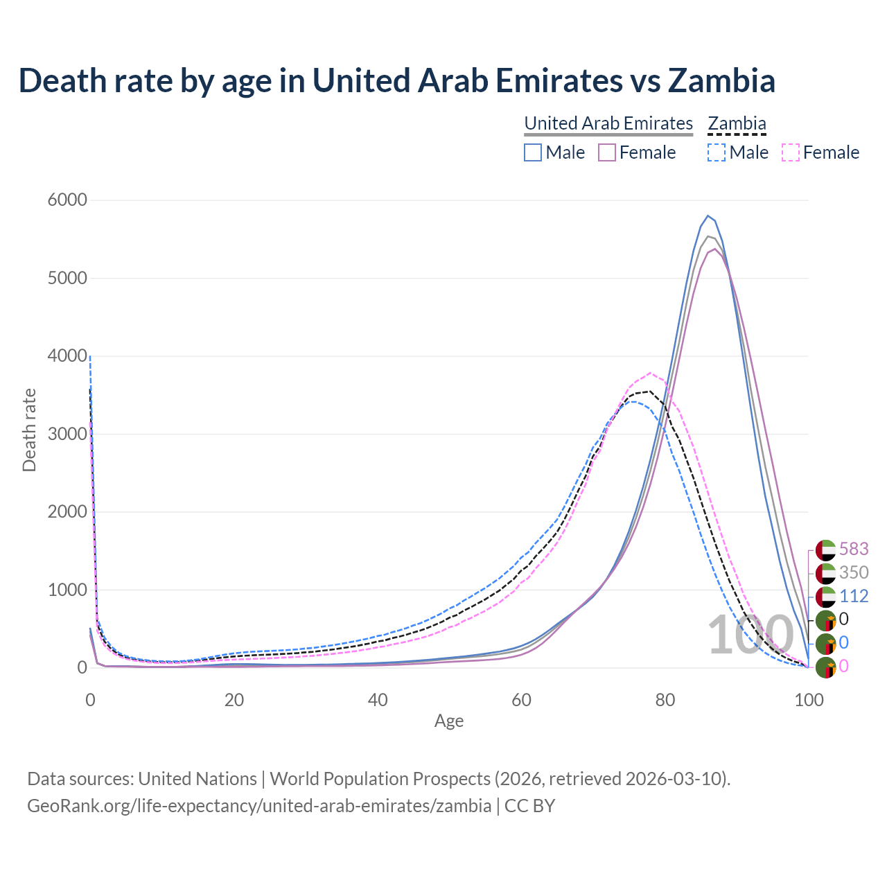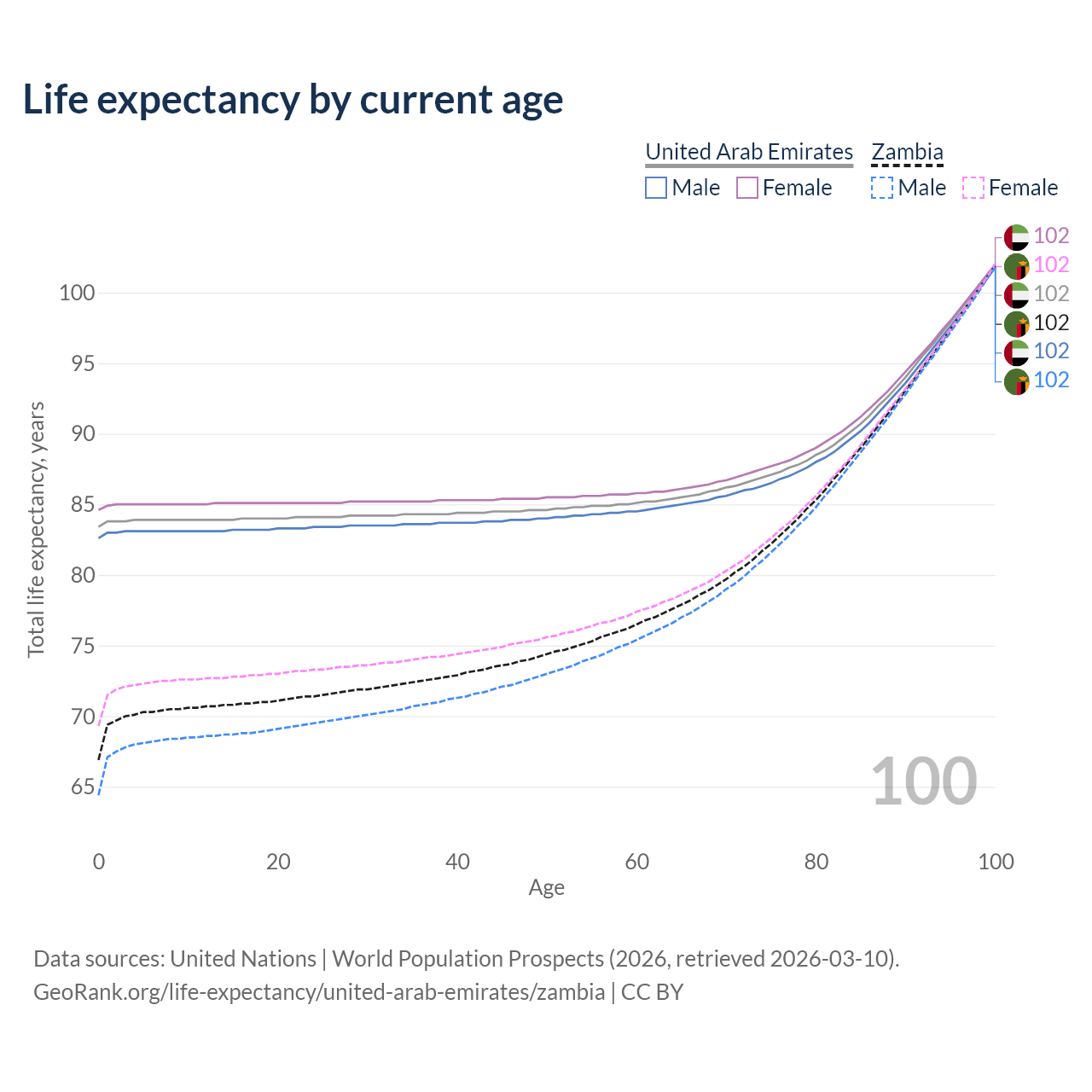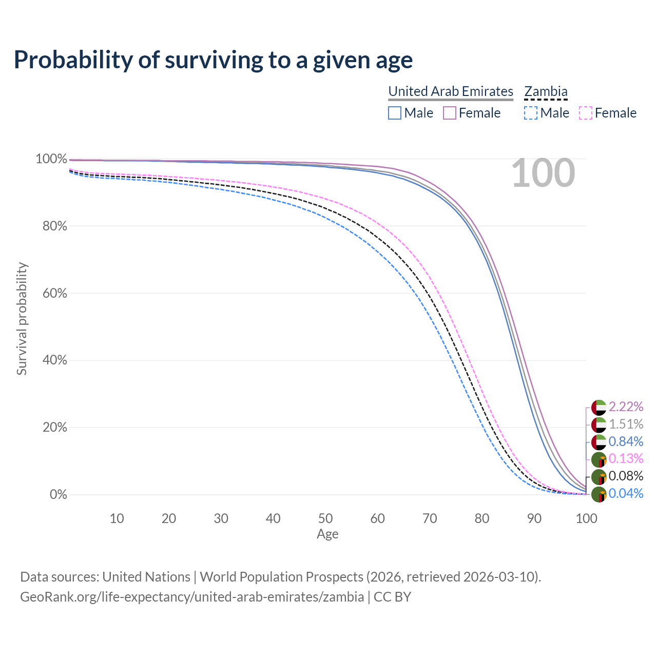This life expectancy calculator shows the odds of living to 100, 95, 90, and below based on current age for both males and females in the United Arab Emirates and Zambia, along with mean and median age of death. The calculations are based on the 2026 life tables (actuarial tables) from the UN World Population Prospects.