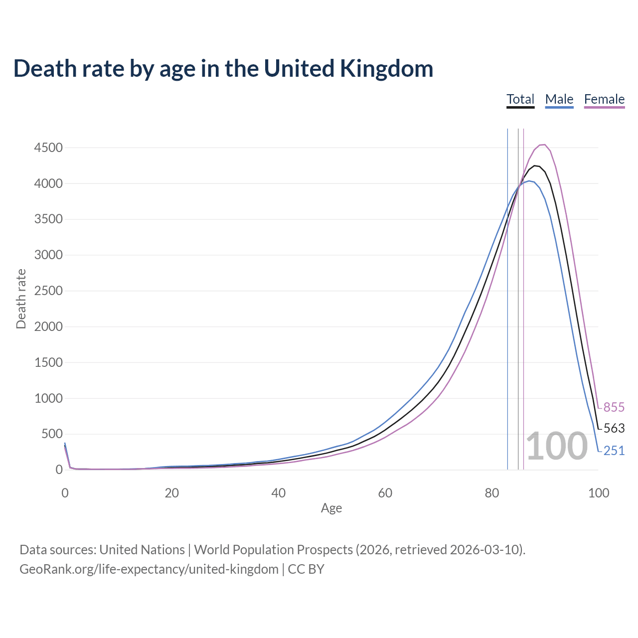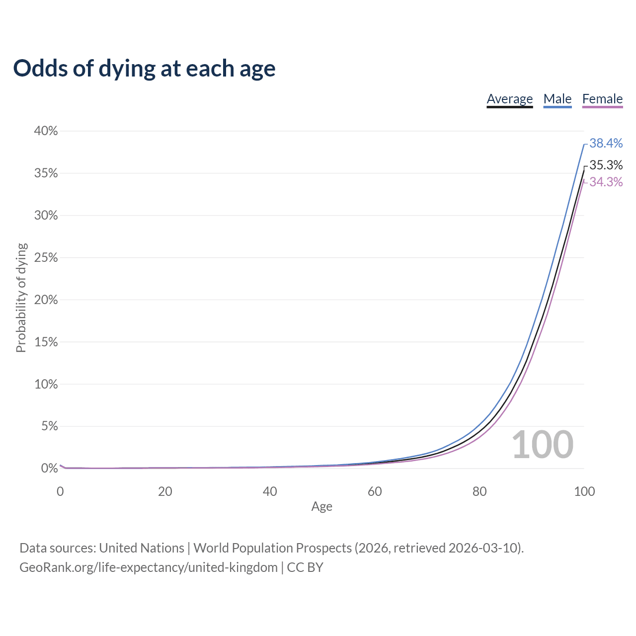 This life expectancy calculator shows the odds of living to 100, 95, 90, and below based on current age for both males and females in the United Kingdom, along with mean and median age of death. The calculations are based on the 2026 life tables (actuarial tables) from the UN World Population Prospects.