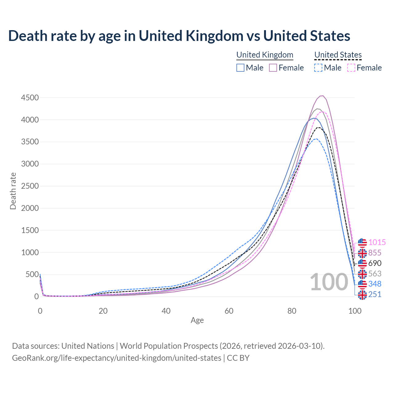 In the United Kingdom, the most common age of death is 88, compared to 89 in the United States. The median age of death is 84.9 in the United Kingdom and 83.9 in the United States, meaning only half of each cohort is expected to live past that age.