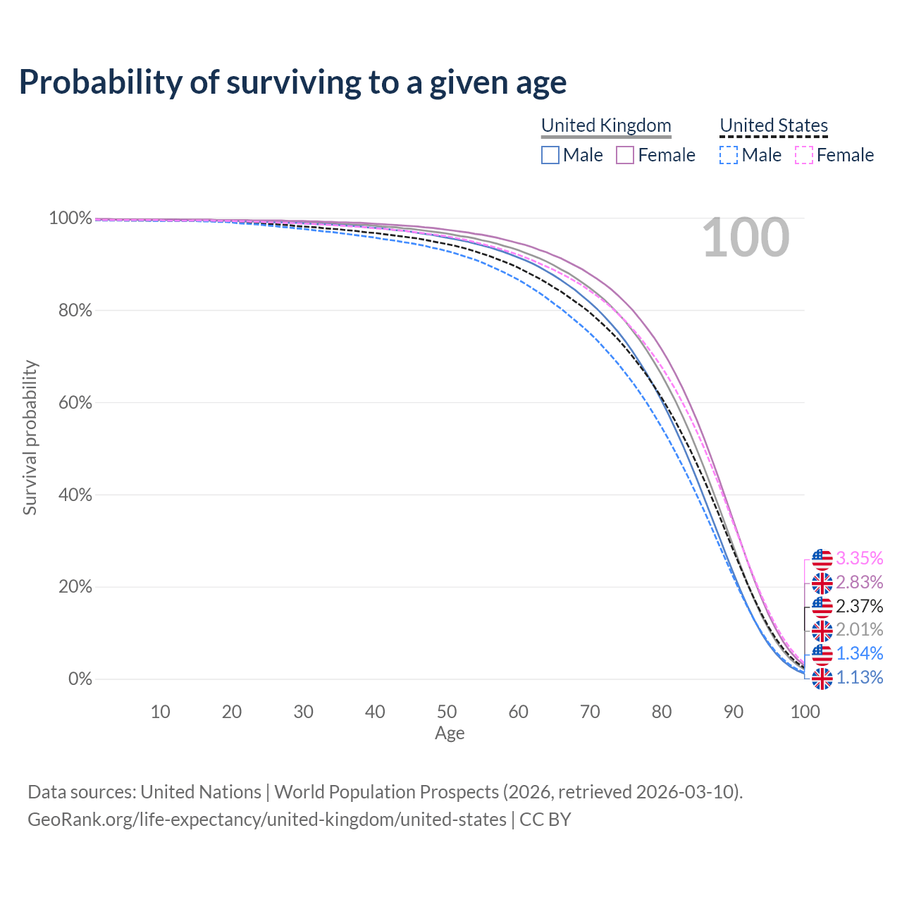 This life expectancy calculator shows the odds of living to 100, 95, 90, and below based on current age for both males and females in the United Kingdom and the United States, along with mean and median age of death. The calculations are based on the 2026 life tables (actuarial tables) from the UN World Population Prospects.