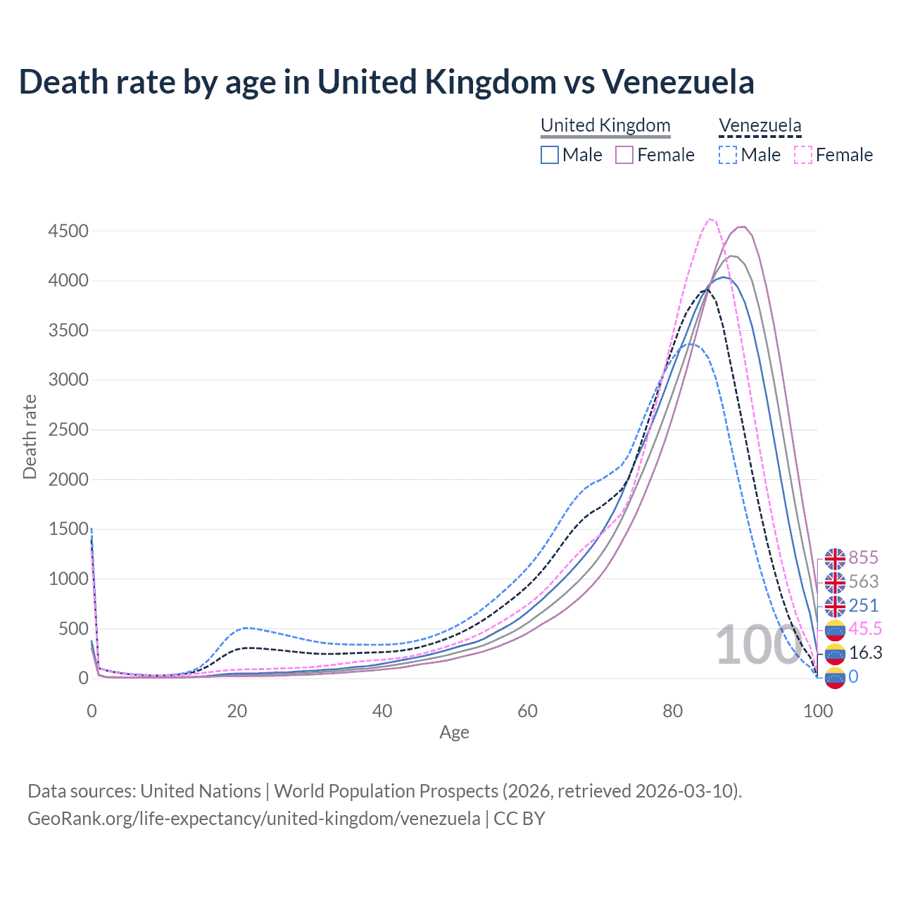 In the United Kingdom, the most common age of death is 88, compared to 85 in Venezuela. The median age of death is 84.9 in the United Kingdom and 79 in Venezuela, meaning only half of each cohort is expected to live past that age.